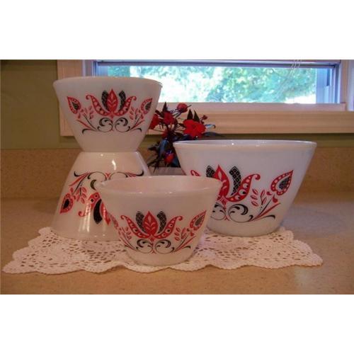 </font></strong>Pleased to offer this complete set of Fire King splash proof bowls in the "Modern Tulip" pattern. This is the black and red design. The bowls are in excellent condition showing no wear on the pattern, and minimal signs of use on the insides. All are embossed on the bottoms: "Fire King Oven Ware". The bowls are super clean and have a beautiful glossy shine. The set includes: 9 1/2" 4Qt., 8 1/2" 3Qt., 7 5/8" 2Qt., and 6 3/4" 1Qt. sizes. Very pretty pattern.</font>
