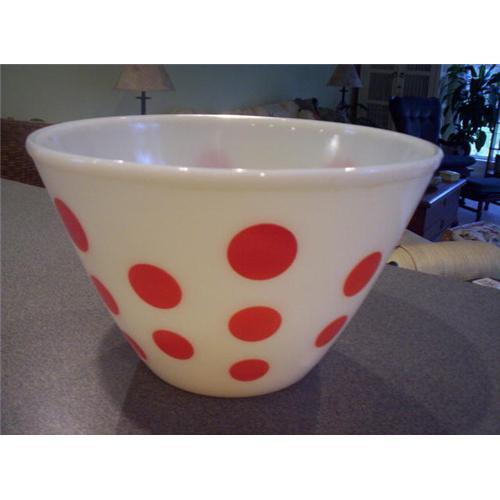 This is a 9.5 inch milk glass splash bowl made by Fire King in their Red Dot pattern. It is the largest of the nesting set. No chips or cracks are noted. The color is bright and shiny. There are some minor scratches to the dots which I've tried to show in the pictures. There is also a mold line on the bottom which is a manufacturer's flaw. It is not a crack and can't be seen from the inside. Utensil marks are very faint. In fact it is one of the nicest ones I've seen in a long while. This is one of the most collectible Fire King patterns. If you've been thinking about completing or building a set, you should take a look at this beauty!