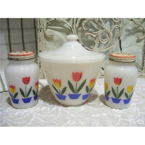 <tr><td>Title:Fire King Tulips Range Set Grease Jar Shakers</td></tr>