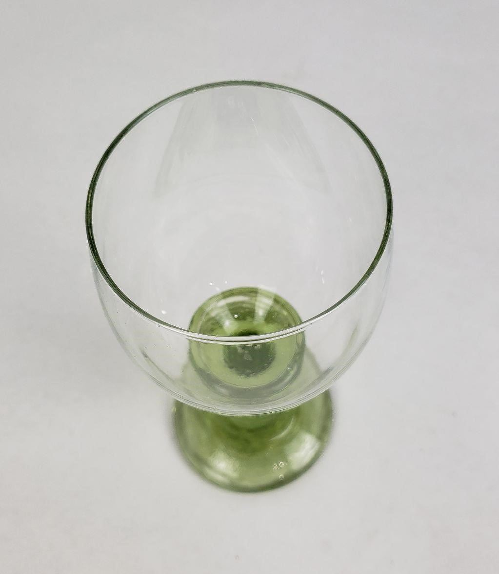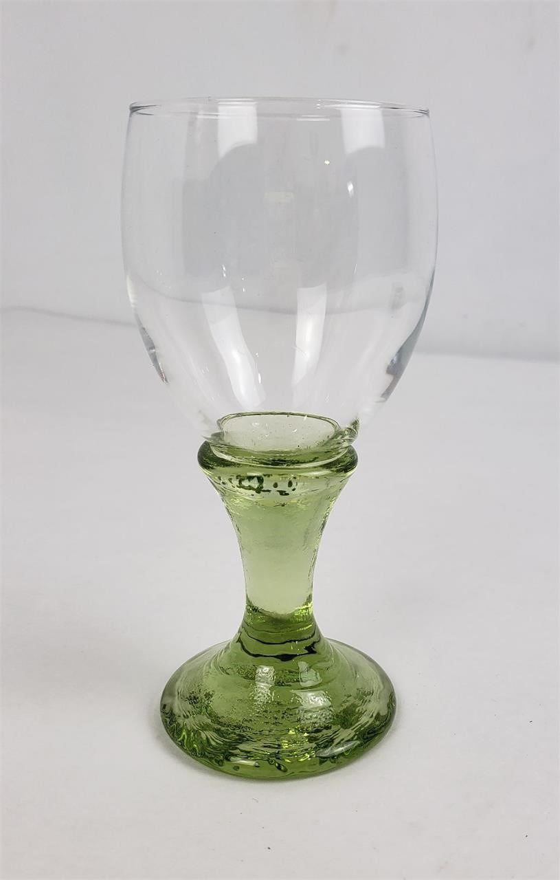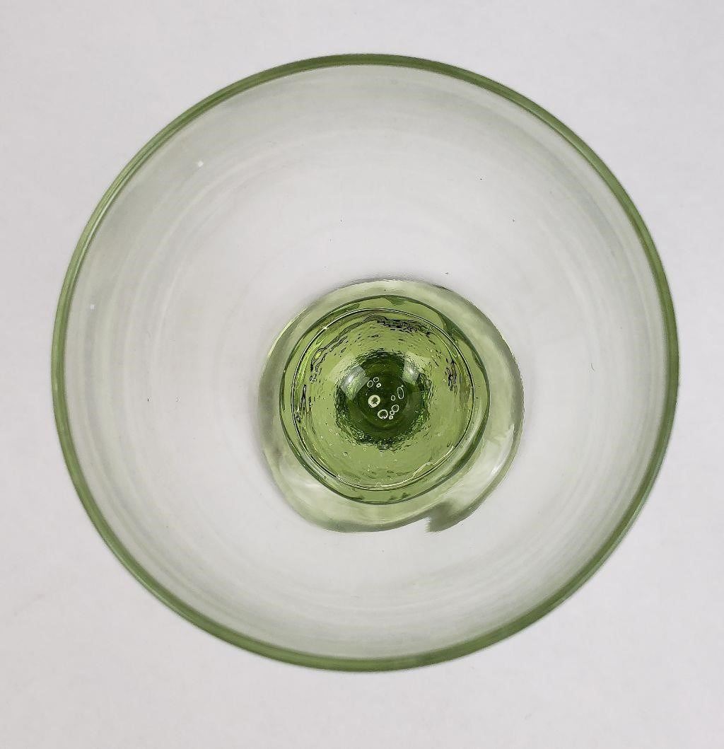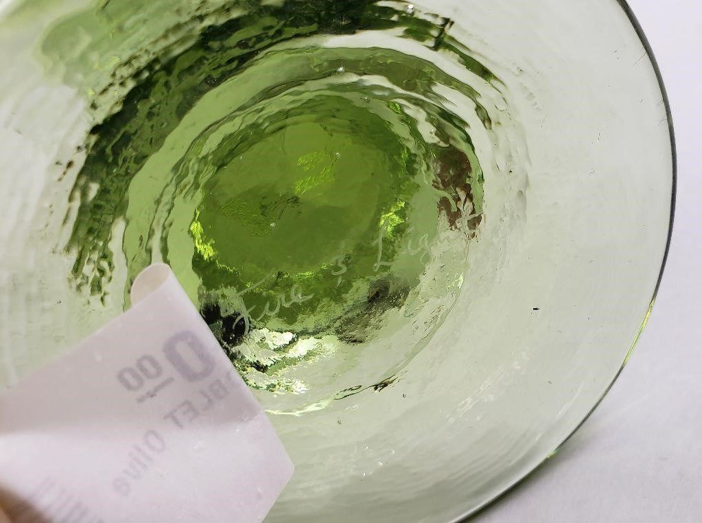 Brand new Olive Wine Goblet. Never used. This item is in perfect condition. This item is signed. This item is made of recycled glass by hand from the Fire & Light Studio. This is a first quality. There may be bubbles on the base as pictured. The goblet may be dirty from storage, they have never been washed.