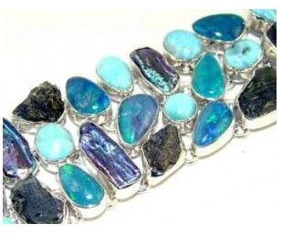 Silver & Fire Opal, Larimar, Biwa Pearl and Moldavite Bracelet. Allow 6 to 8 weeks for delivery.