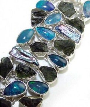 Silver & Fire Opal, Modavite and Biwa Pearl Bracelet. Allow 6 to 8 weeks for delivery.