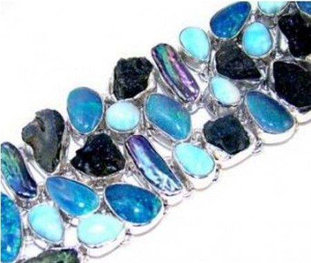 Silver & Fire Opal, Moldavite and Larimar Bracelet. Allow 6 to 8 weeks for delivery.