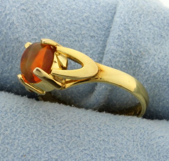 In 14K yellow gold the 7x6mm fire opal has and orange color with flashes of green. Size 7 3.2g