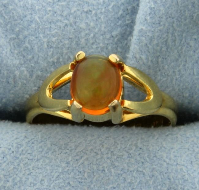 In 14K yellow gold the 7x6mm fire opal has and orange color with flashes of green. Size 7 3.2g