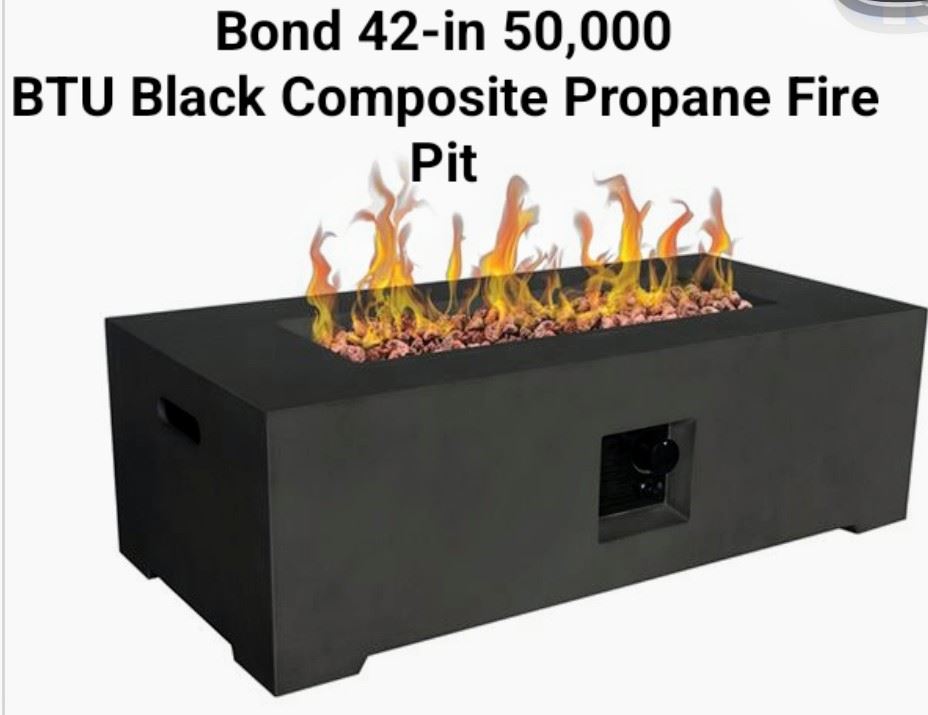 Bond 42-inch rectangular propane fire pit, 50,000 BTU output, modern black composite construction, new.