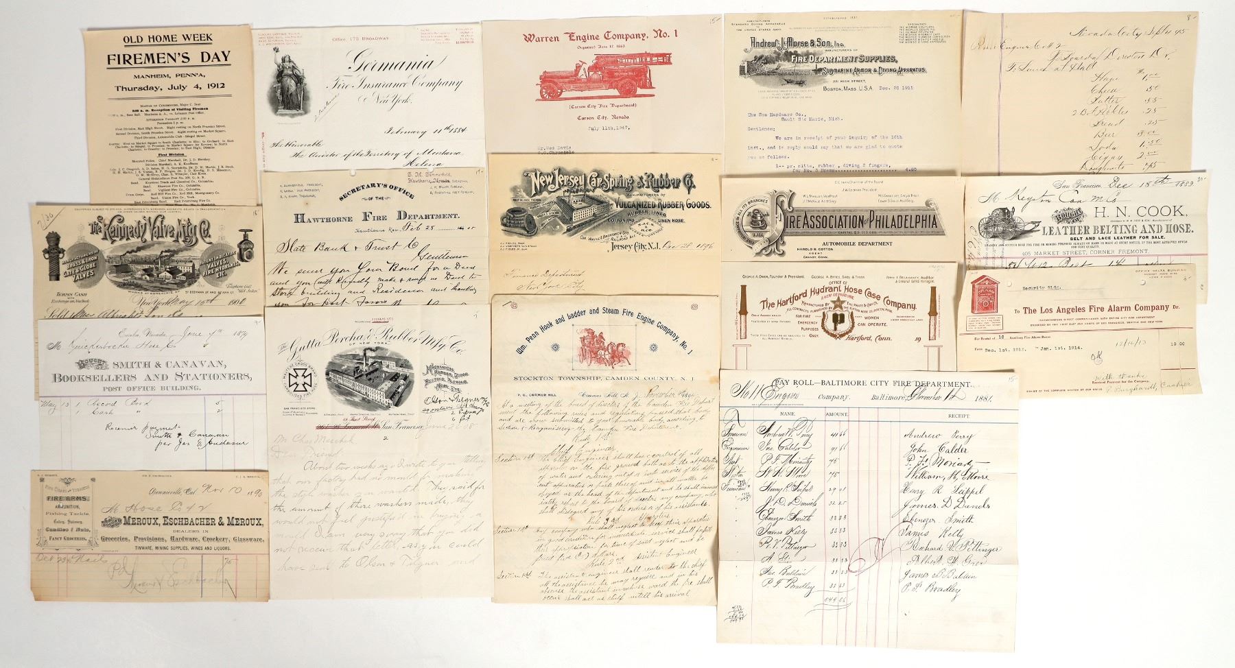 Lot of 17. Includes 14 letterheads and billheads, most pictorial (HN Cook Leather Belting & Hose, San Francisco; Fire Assoc. of Philadelphia; Hartford Hydrant; Andrew J Morse & Son Fire Dept. Supplies, Boston; two page letter Wm. Penn Hook & Ladder & Steam Fire Engine Co. No. 1, NJ; New Jersey Car Spring & Rubber Co.; Warren Engine Co. No. 1 Carson City, NV; Gutta Percha & Rubber Mfg., SF; Hawthorne Fire Dept., Nevada; Germania Fire Insurance Co., NY; Kennedy Valve Mfg., NY; Smith & Canavan, Eureka, NV; Meroux, Eschbacher & Meroux (Downieville); Los Angeles Fire Alarm Co.). Flyer for Old Home Week Firemen's Day, Manheim, PA, 1912. Manuscript receipt for Nevada City, 1895, Penn. Engine Co. No. 2. And 1881 Pay Roll for Baltimore City Fire Dept. 1870s-1940s, most pre-1900. Please inspect.