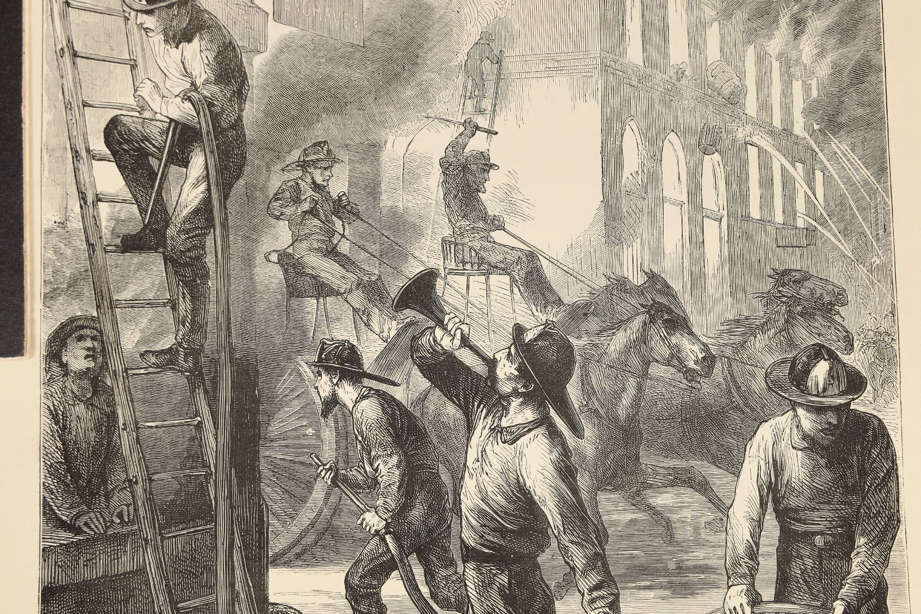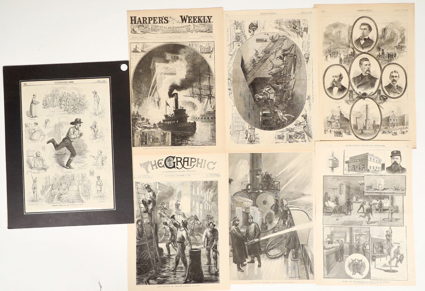 Lot of 7. All approx. 11 x 15" 1) A Fire at a New York Dock, Harper's Weekly, Nov. 11, 1882. 2) The Fireboat "New Yorker", Harper's Weekly, Feb. 2, 1891. 3) "The Burning of Chicago--Fireman at Work", The Graphic, Oct. 2, 1871. 4) The New York Fire Ins. Patrol, Harper's Weekly, March 4, 1876. 5) "The Fire Dept. of Chicago and it's Methods", Frank Leslie's Illustrated News, June 26th, 1886. 6) "The Chicago Fire Dept.", Harper's Weekly, Dec. 19th, 1874. 7) "Sketches from America Characters", Illustrated Times, June 1, 1861.