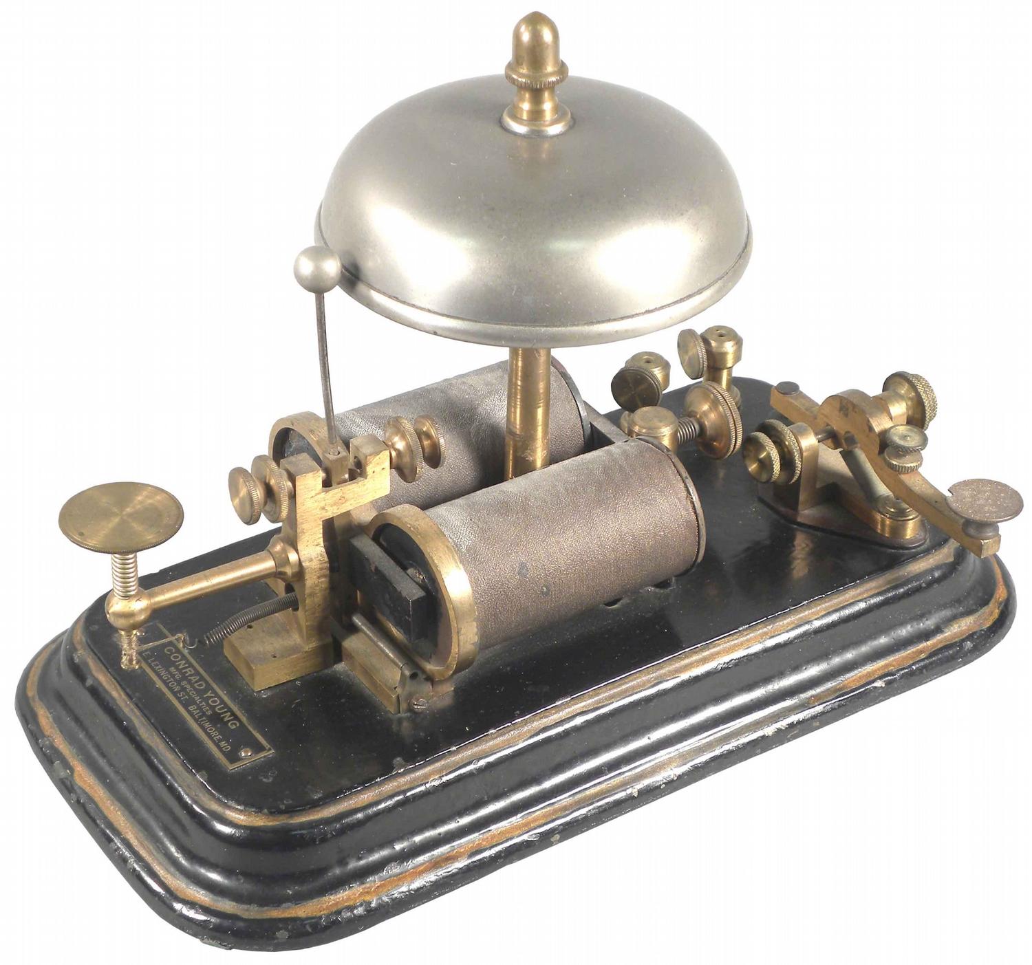 Fire Tapper Bell. Conrad Young Mfg. Baltimore, MD. This item was used to manually tap out the number of the call box that was reporting the fire. Cast iron and brass. Very good condition. 4 1/2 inch bell.