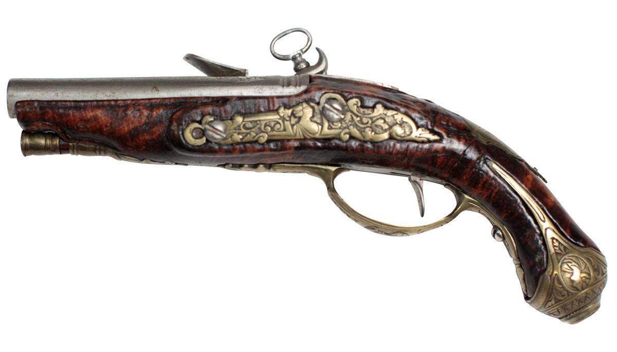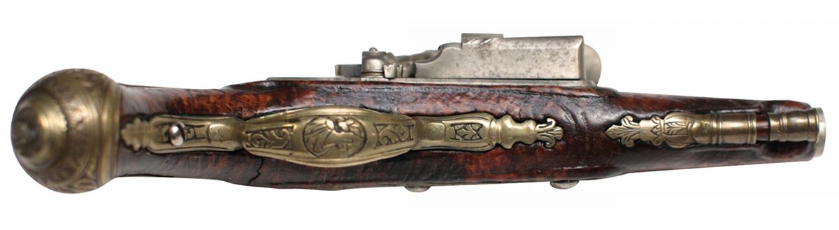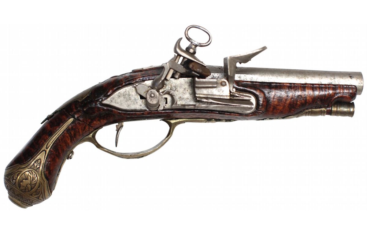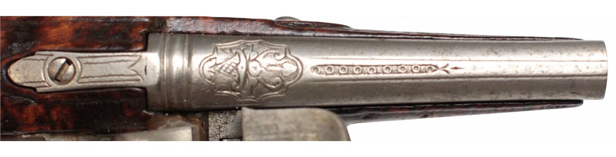 Firearm, miquelet flintlock pistol, heavily engraved c.1820, VG cond w/split in handle, total 8"L.