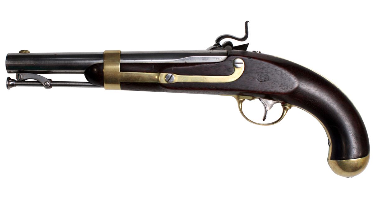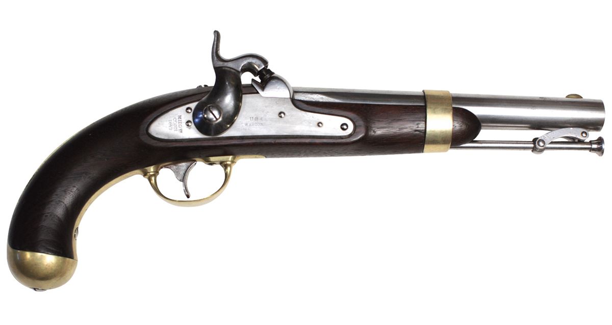Firearm, percussion pistol, Henry Aston U.S. Model 1842 .54 cal, trigger guard, buttcap & back strap in brass, Exc polished cond, total 14.5"L.