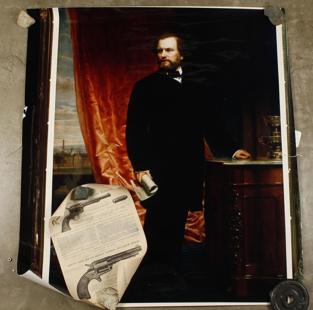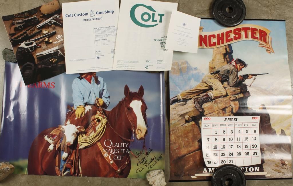 Large Color Photograph of a famous painting of Samuel Colt by Charles Loring Elliott, Colt Firearms Poster signed by Di Baxter C.C.A.1995, Reproduction catalog 1856-1884 of Colt Firearms, Winchester 1990 Calendar, and Colt Custom Gun Shop Buyers Guide 1984-85.
