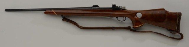 Firearms International sporting bolt-action rifle built on an FN Belgian action, “Musketeer” Model, .300 Win. Mag. cal., 23” barrel with scope mounts, blue finish, bright bolt, custom thumb hole stock with sling,#R01654 in overall very good to near fine condition with fine bore, crisp action and beautiful custom wood stock. Est.: $350-$700.