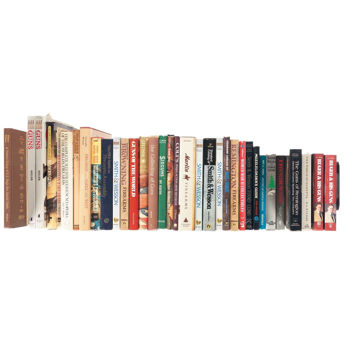 Approximately 34 books including "Sixguns" by Keith, (2) The Illustrated Book of Guns" edited by David Miller, "Firearms of the American West 1803-1865" by Garavaglio & Worman, "The Collecting of Guns" by James Serven, "Guns Of The World" by Bonanza Books, "Civil War Collectors Encyclopedia" by Francis Lord, "Marlin Firearm", (3) "Standard Catalog of Smith & Wesson" by Krause, "The World of Beretta" and (2) "Ruger & His Guns" by R.L. Wilson, "Keith's Rifles for Large Game" by Keith and "John M. Browning American Gunmaker" by John Browning & Curt Gentry to name a few.