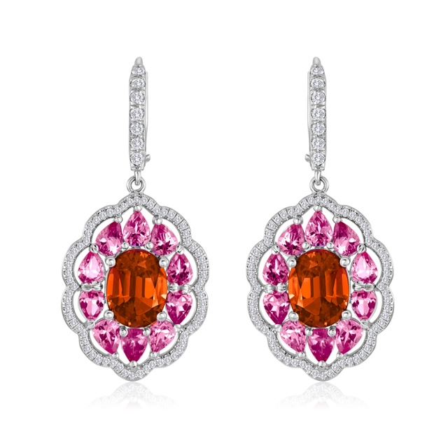 Firebird is a magical bird whose plumage shines with Fairy colors.These Orange/Red Spinel where inspired by Firebird.Made with 18 K white GoldOrange/Red Spinels 5.00 CT's TW20 pink Spinels 3.45 CT's TW145 Diamonds .50 CT's