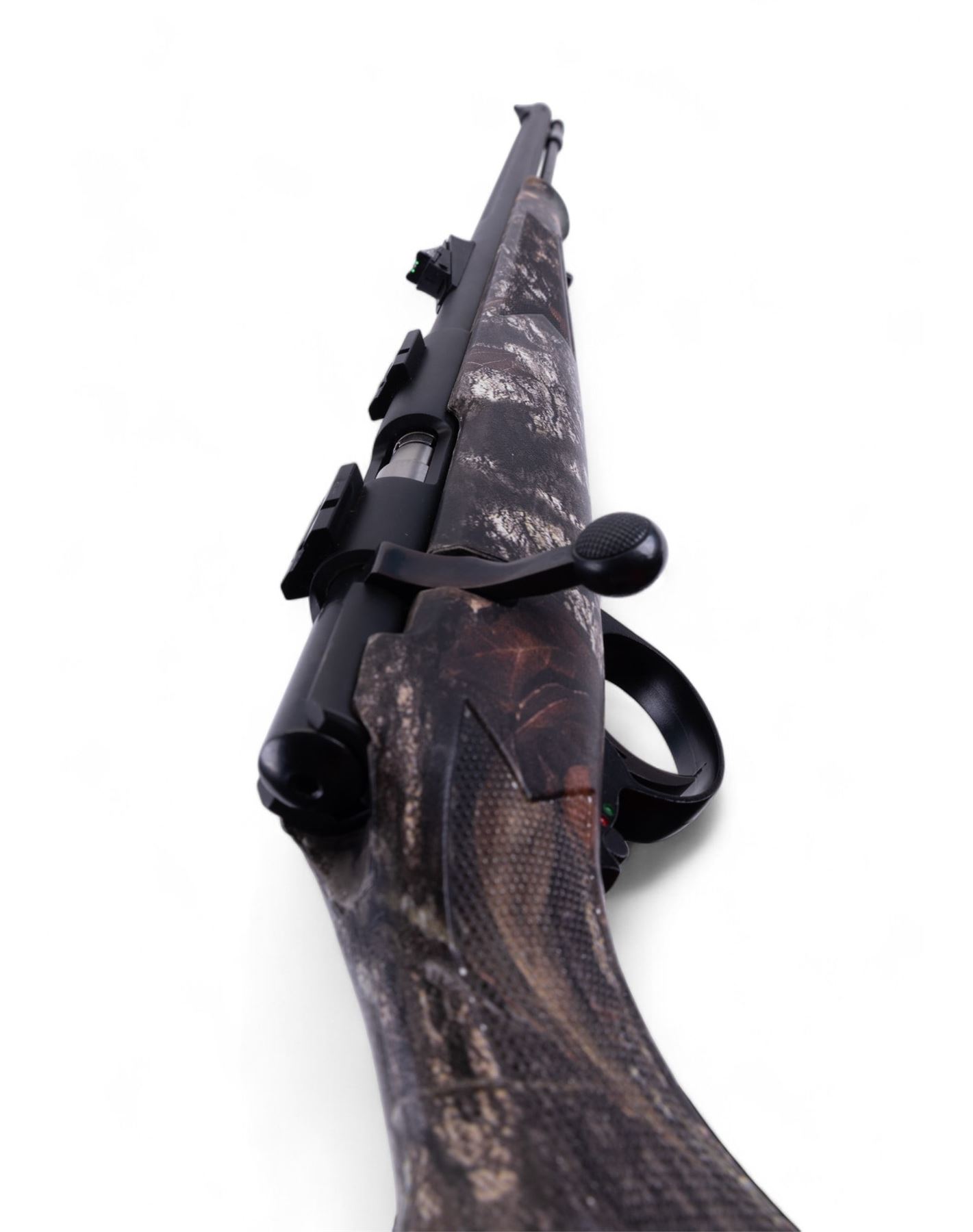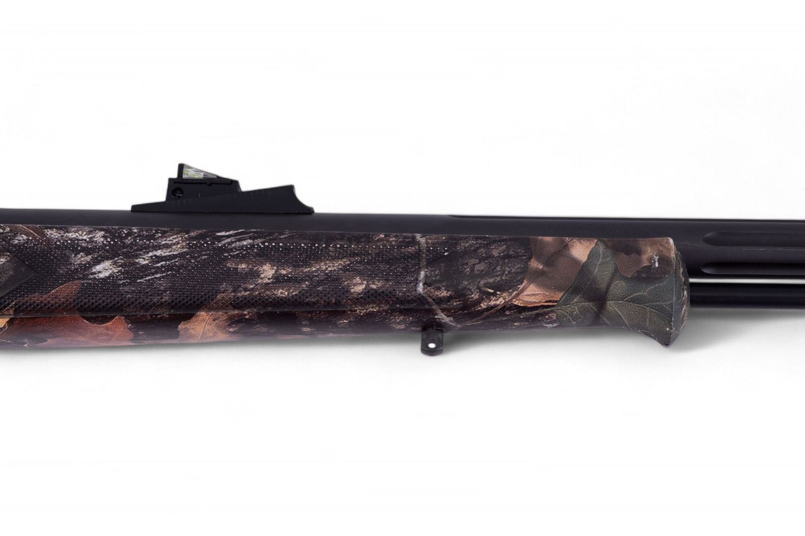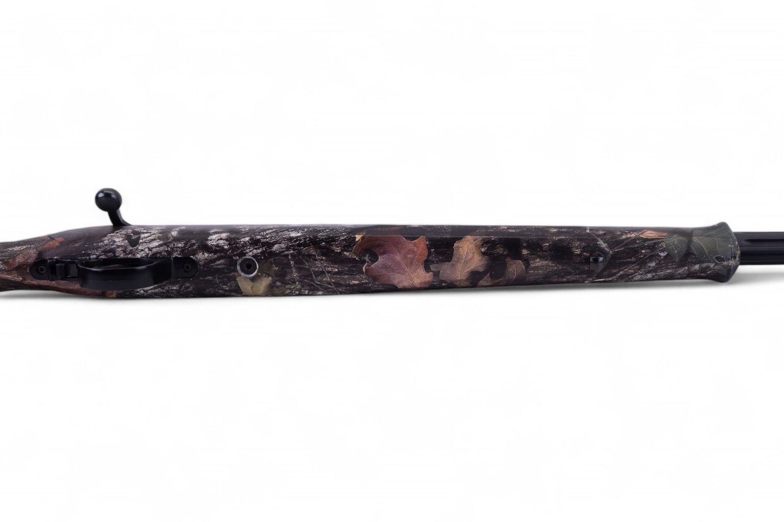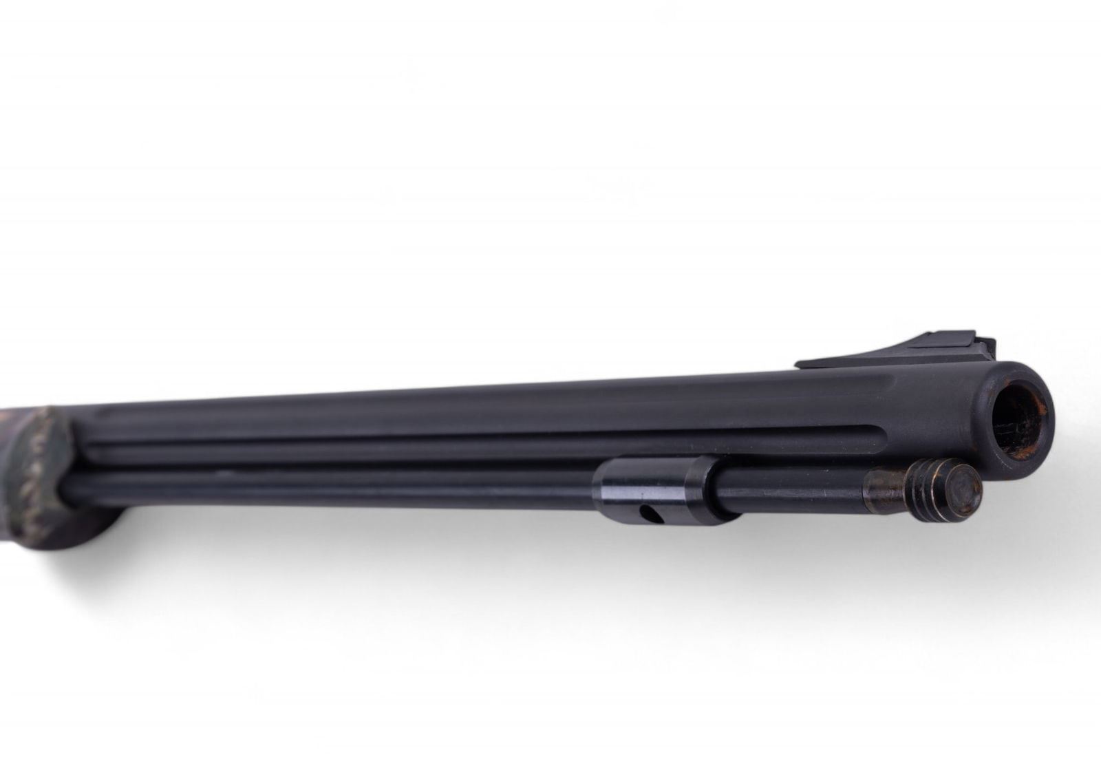 Features a camouflage finish. Bolt action primer load. Ramrod included. Made by BPI Connecticut Arms. Fiber optic sight at muzzle missing.