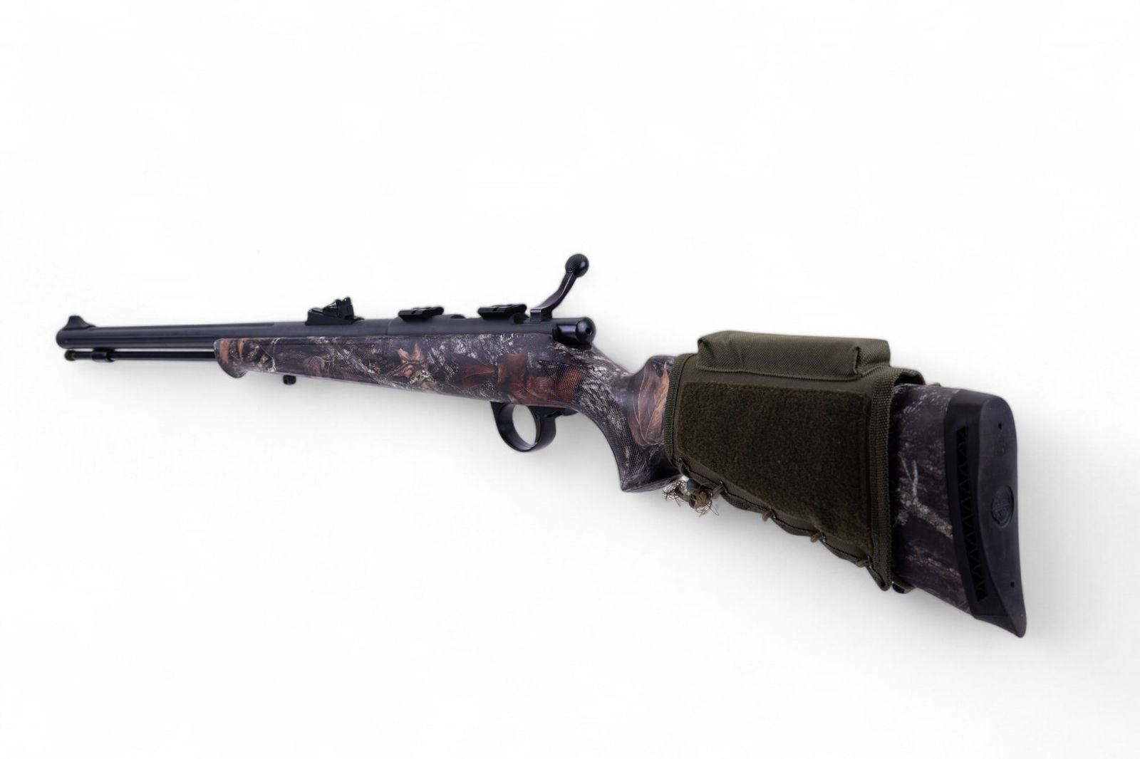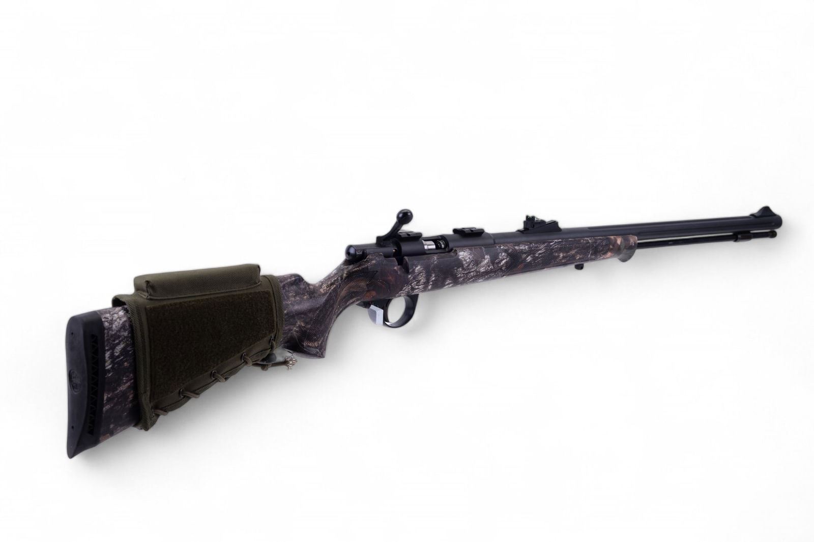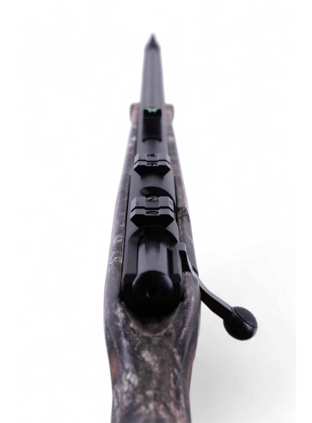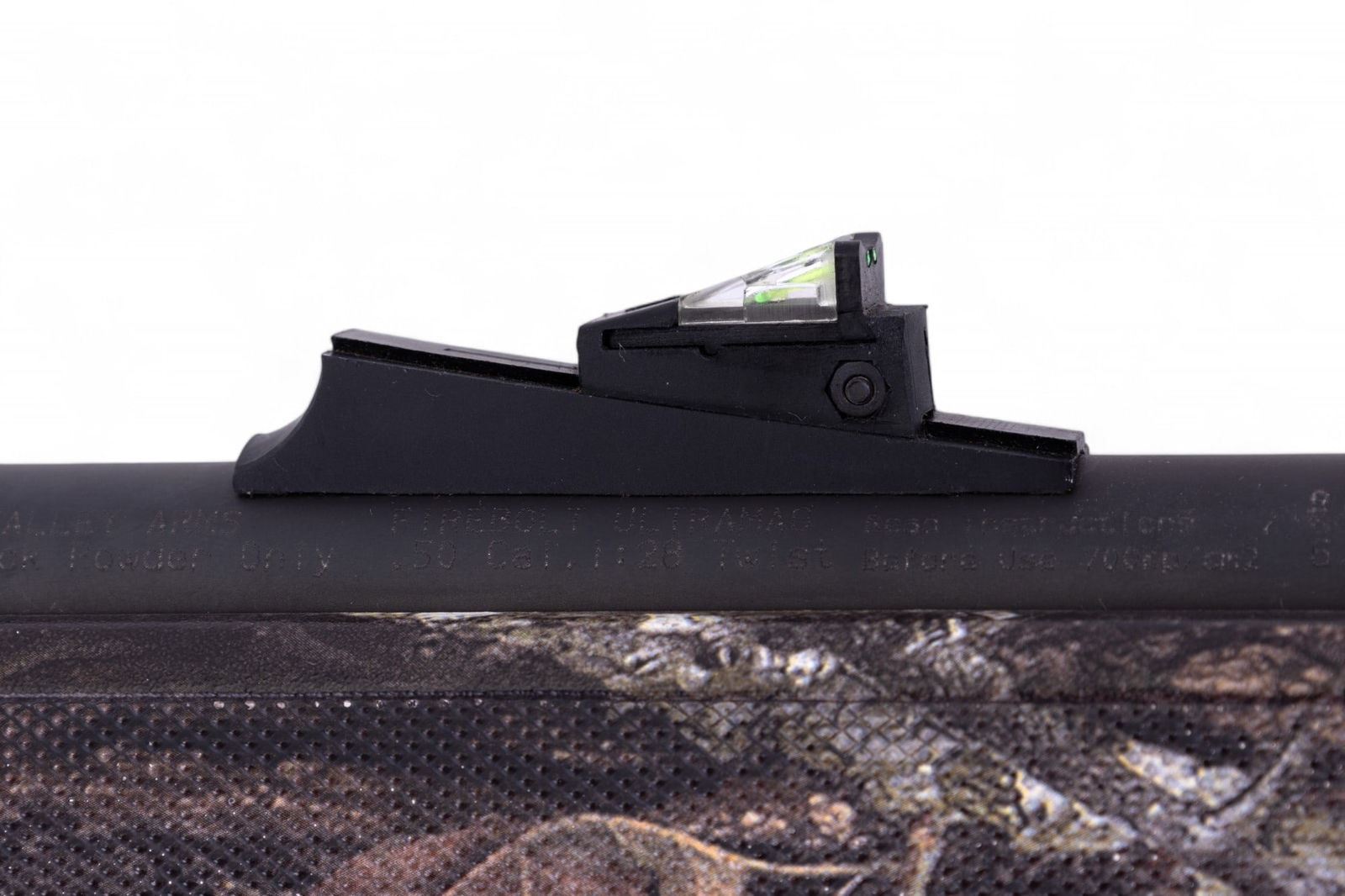 Features a camouflage finish. Bolt action primer load. Ramrod included. Made by BPI Connecticut Arms. Fiber optic sight at muzzle missing.