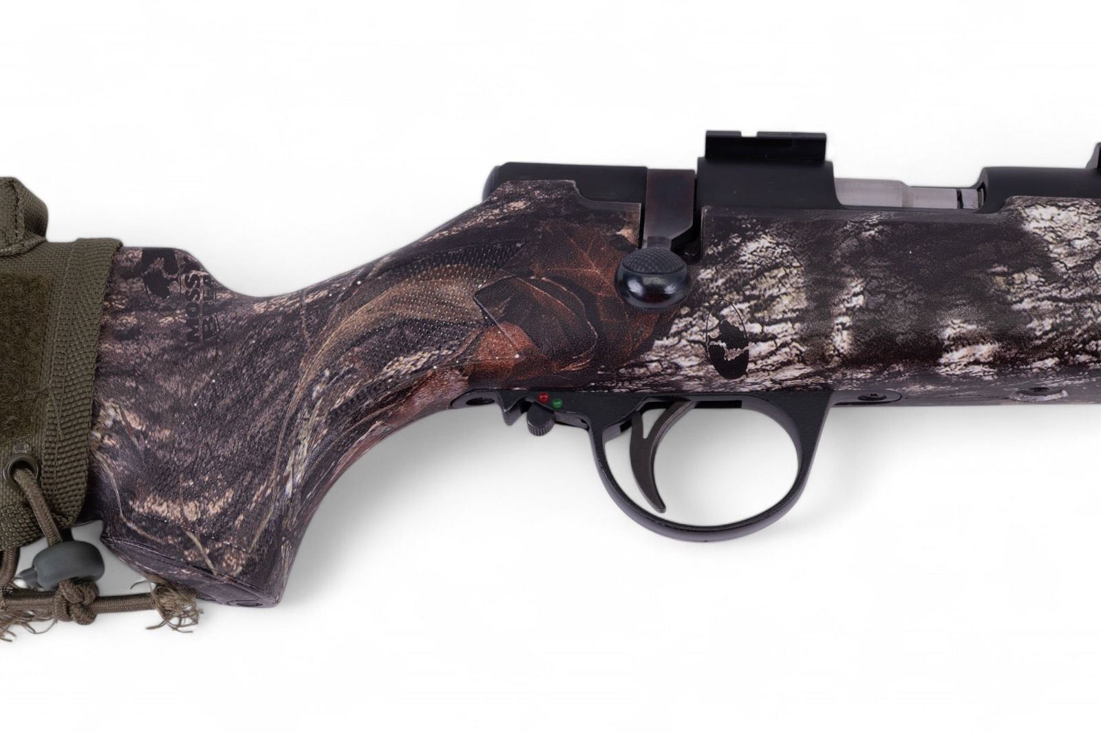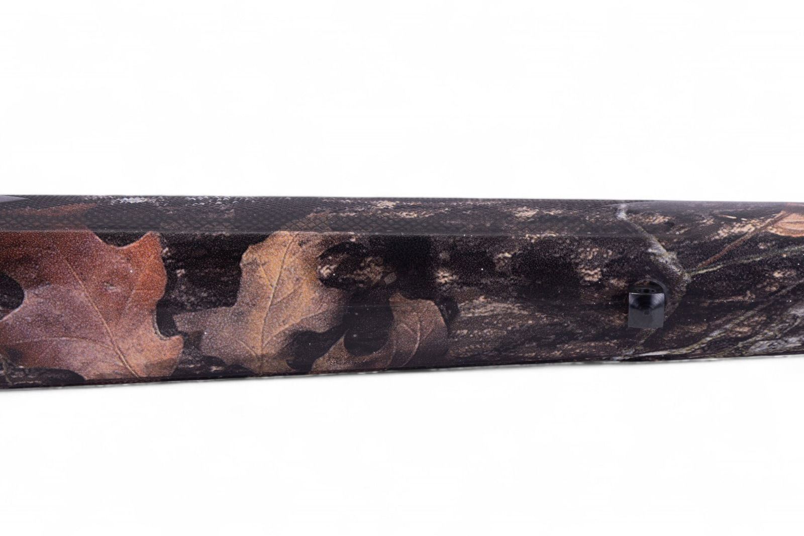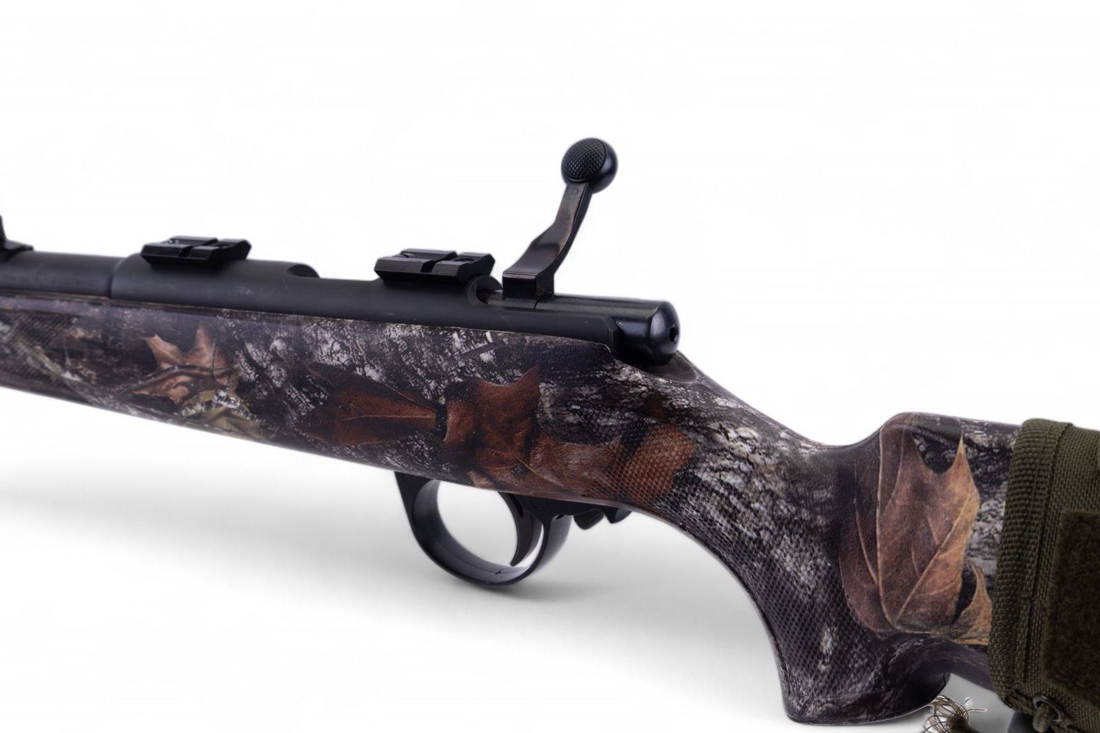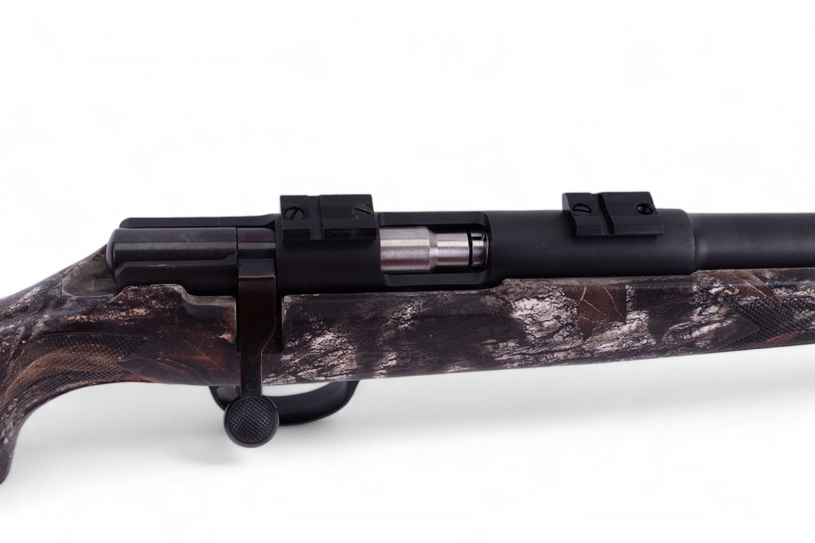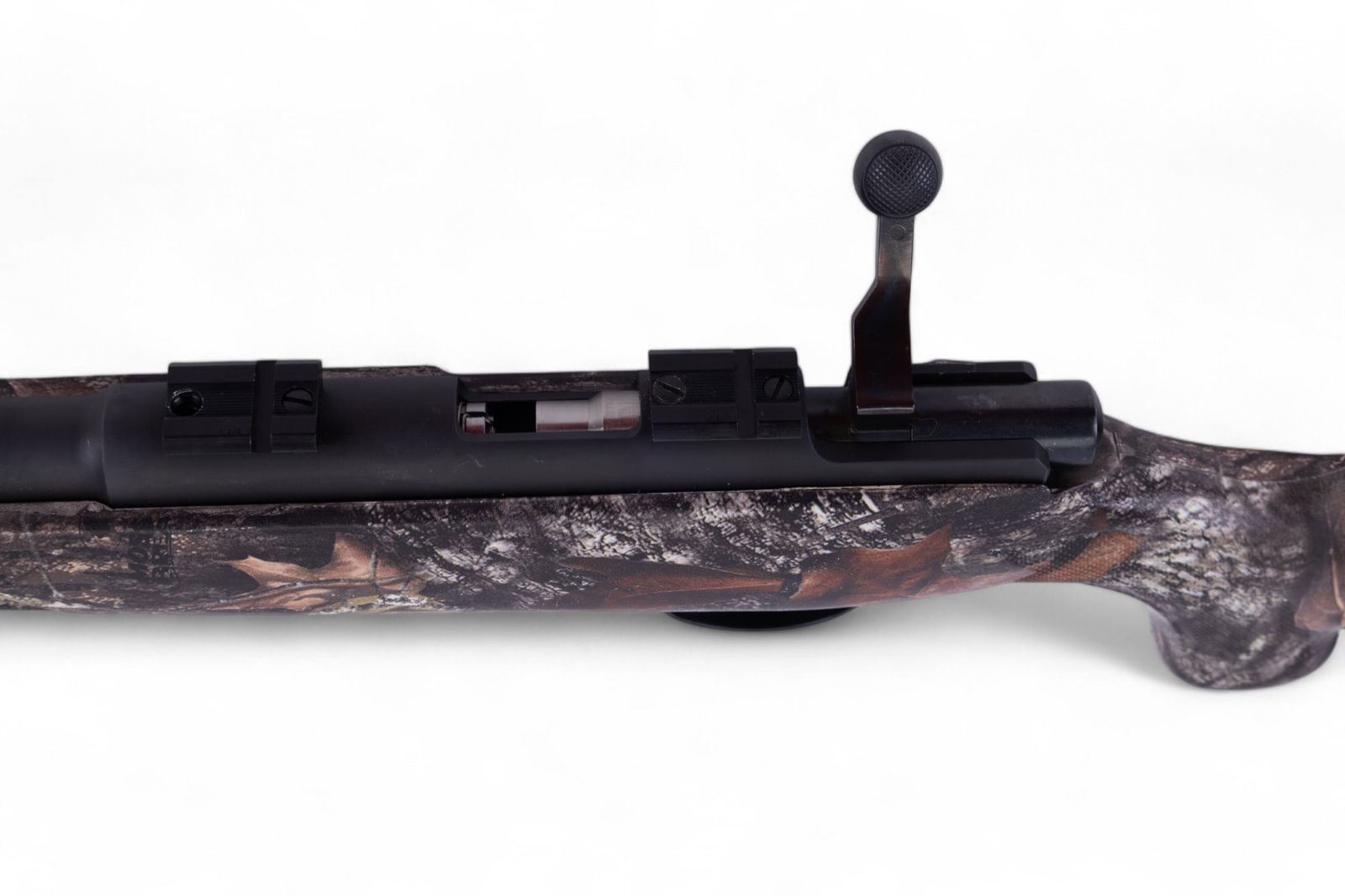 Features a camouflage finish. Bolt action primer load. Ramrod included. Made by BPI Connecticut Arms. Fiber optic sight at muzzle missing.