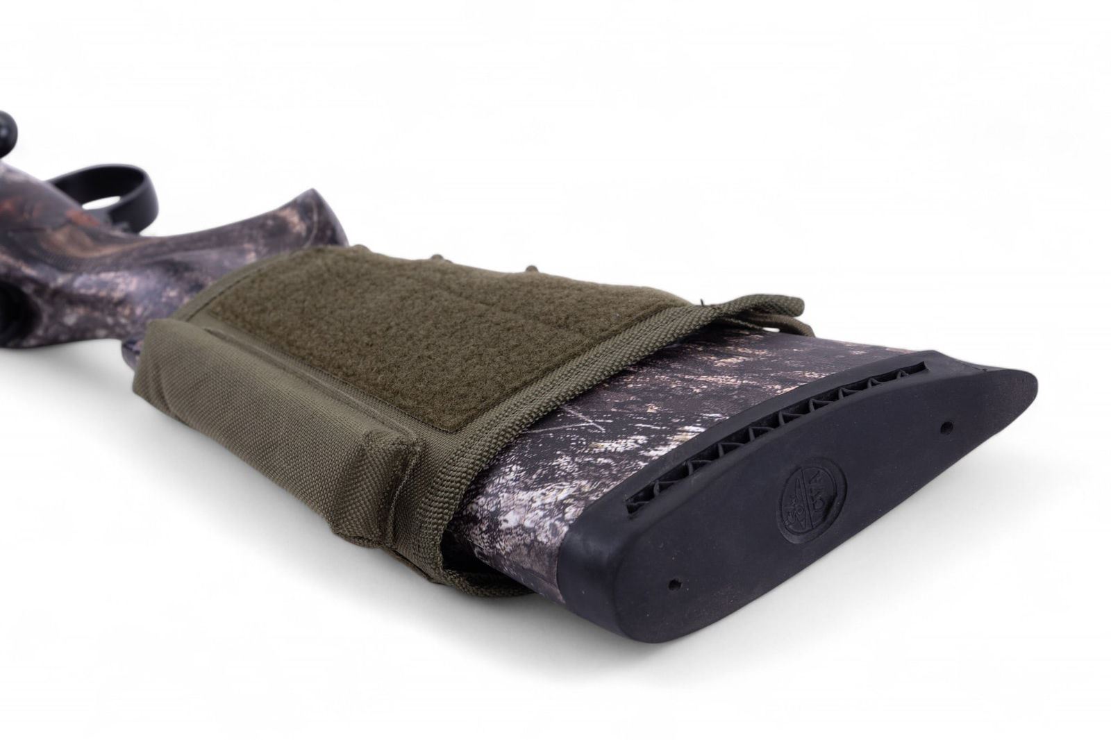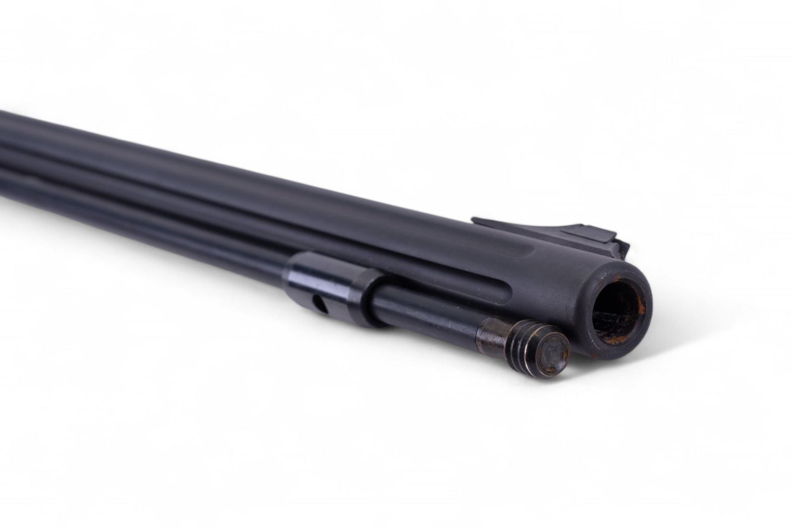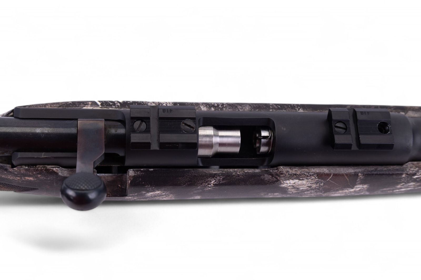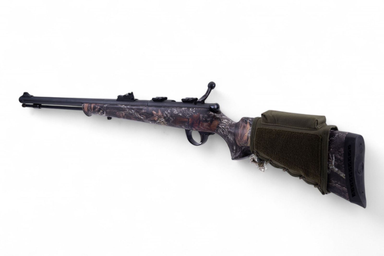 Features a camouflage finish. Bolt action primer load. Ramrod included. Made by BPI Connecticut Arms. Fiber optic sight at muzzle missing.