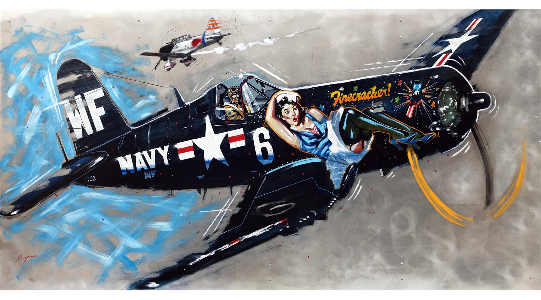 Michael Bryan pays tribute to WWII pilots as they head into battle in their pin-up girl adorned planes. This is a 20x40" hand-worked giclee on canvasm, numbered 1/1.