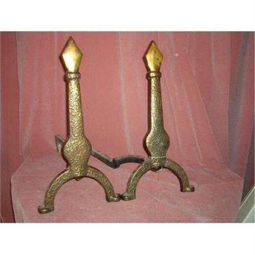 An original pair of hand beaten brass firedogs. Circa 1910. Brass and Iron. 17"high X 9" Wide X 15" deep. English.