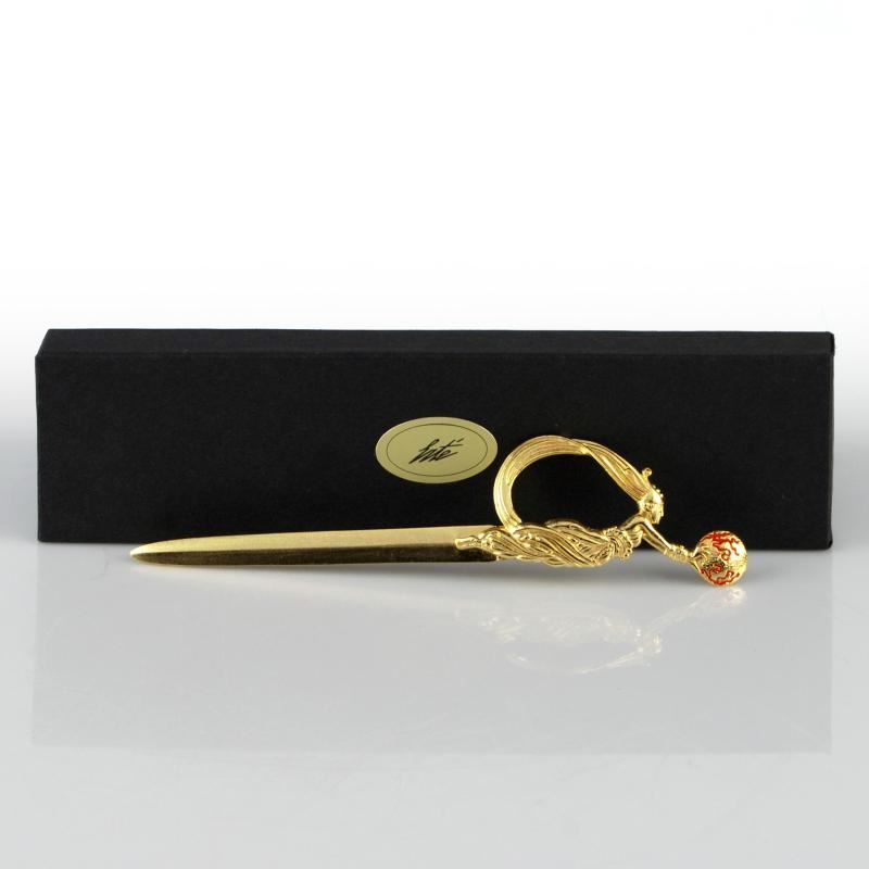 From an original design by the "Father of Art Deco", bid now on this Erte letter opener! Made of gold plated pewter with a gold plated steel blade, this stunning piece is accented with the perfect touch of red enamel. Measures approx. 1.5" x 6.5".