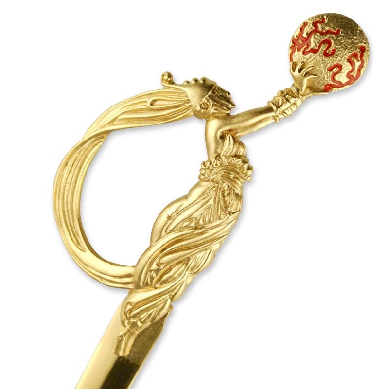 From an original design by the "Father of Art Deco", bid now on this Erte letter opener! Made of gold plated pewter with a gold plated steel blade, this stunning piece is accented with the perfect touch of red enamel. Measures approx. 1.5" x 6.5".
