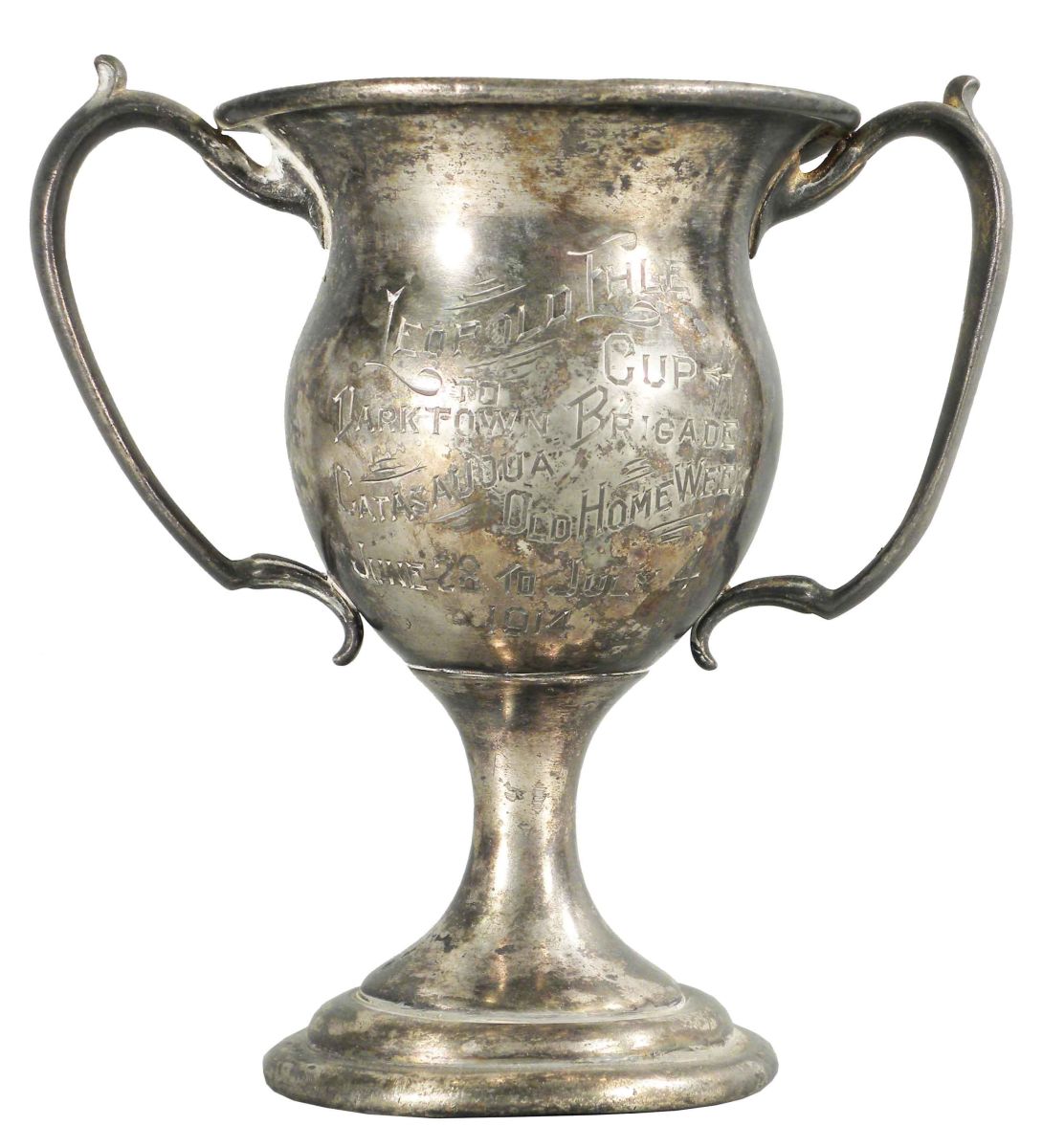 Fireman's Brigade Presentation Loving Cup, silver plated. Darktown Brigade, June 28-July 4, 1914. Simpson H & M Company USA makers. Most of the silver worn otherwise good condition. 6 1/2 inches tall.