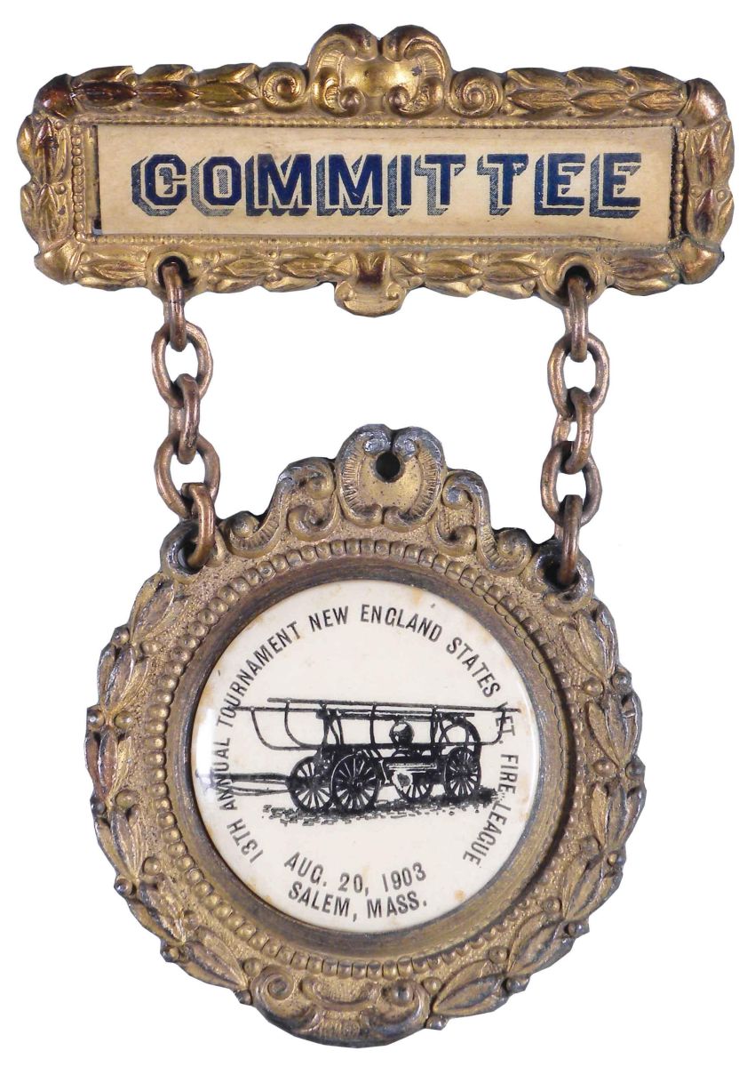 Fireman's Committee Badge. 13th Annual Tournament New England States Veteran Fire League. August 10, 1903, Salem, Mass. Very good condition. 2 1/2 X 3 1/2 inches. Start Price $30
