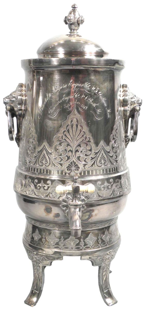 Fireman's Presentation Footed Coffee Urn, silver plated. Patented June 1868 Rogers Smith & Co. New Haven, CT. Presented to Engine Co. No. 3, Dedham, Mass. By Kennebec Engine Co. No. 4 Bath, ME. Sept 1869. Good condition. 18 inches tall.