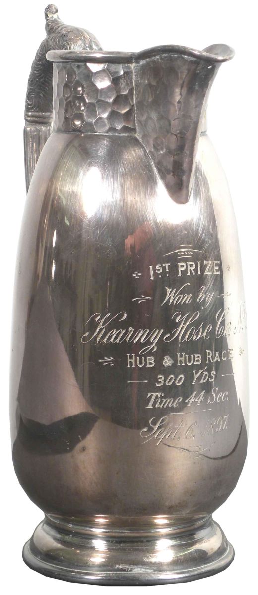 Fireman's Presentation Pitcher, silver plated. Reed & Barton Mfg. Inscribed First Prize won by Kerney Hose Co. No 2. Hub and Hub Race 900 yds time 44 sec. Sept 6, 1897. Very good condition. 10 inches tall.