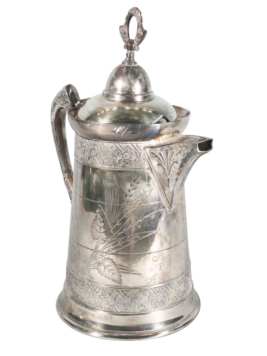 Fireman's Presentation Water Pitcher. Southington Co. (Quadruplate) makers. Presented to D.H. Co. No. 1 by J.B. Collins & Co. Excellent condition. 12 1/2 inches tall.