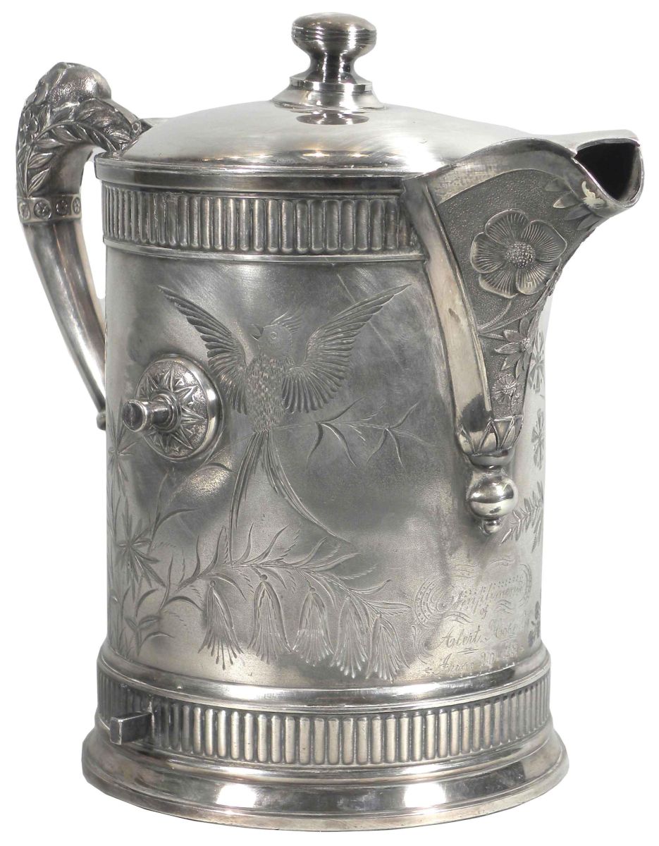 Fireman's Presentation Water Pitcher, silver plated. Compliments of Alert Hose Company June 20, 1888. Hole in bottom, but has glass liner intact. 9 inches tall.