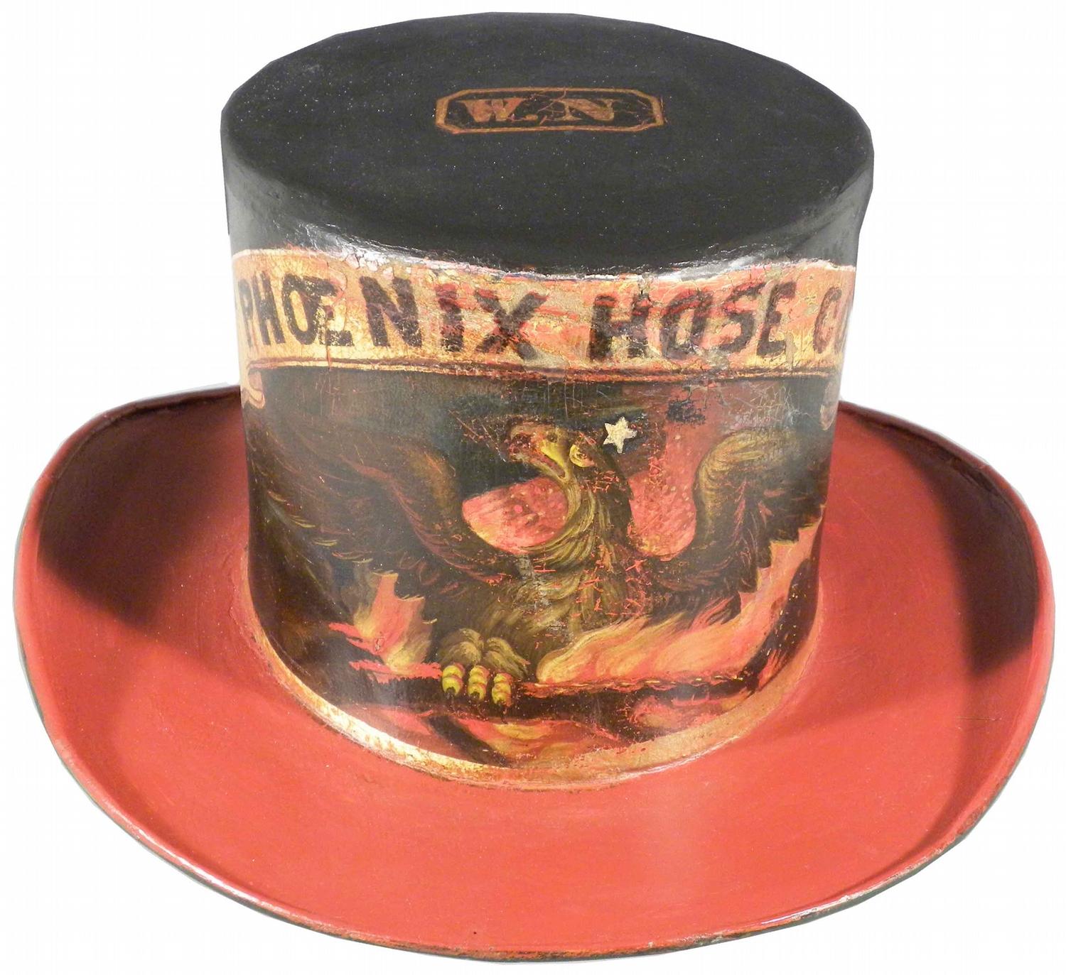 Phoenix Hose Co. Early Firemen's Leather Parade Top Hat. Painted Phoenix and flames on front, "W.N." on top. Excellent condition. 12 X 13 3/4 X 5 5/8 inches.