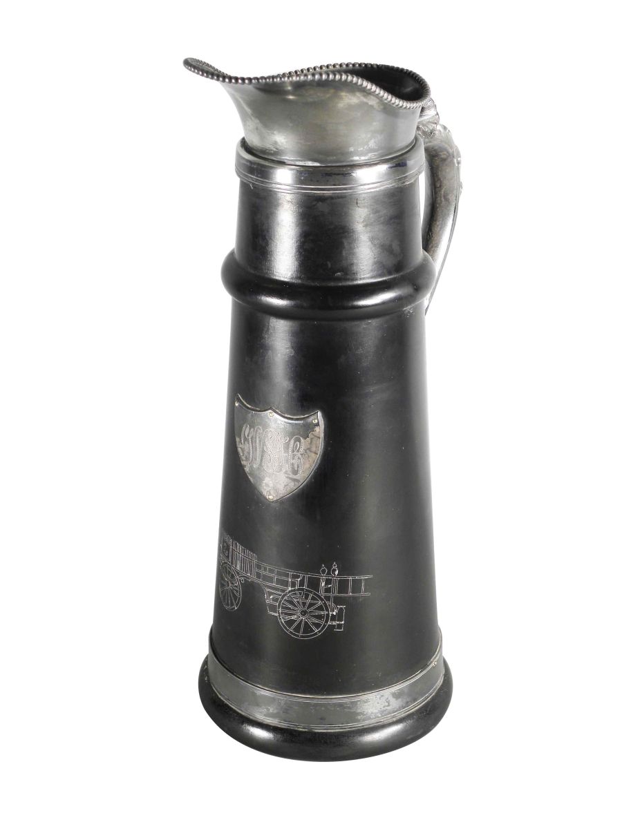 Firemen's Pewter Presentation Pitcher. Engraved hose wagon and monogram on front. 11 1/2 inches tall.