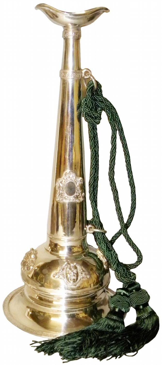 Firemen's Presentation Trumpet. High relief cameos around bell and neck and greek key bands top and bottom. Excellent condition. 7 7/8 inch diameter bell X 18 inches tall.