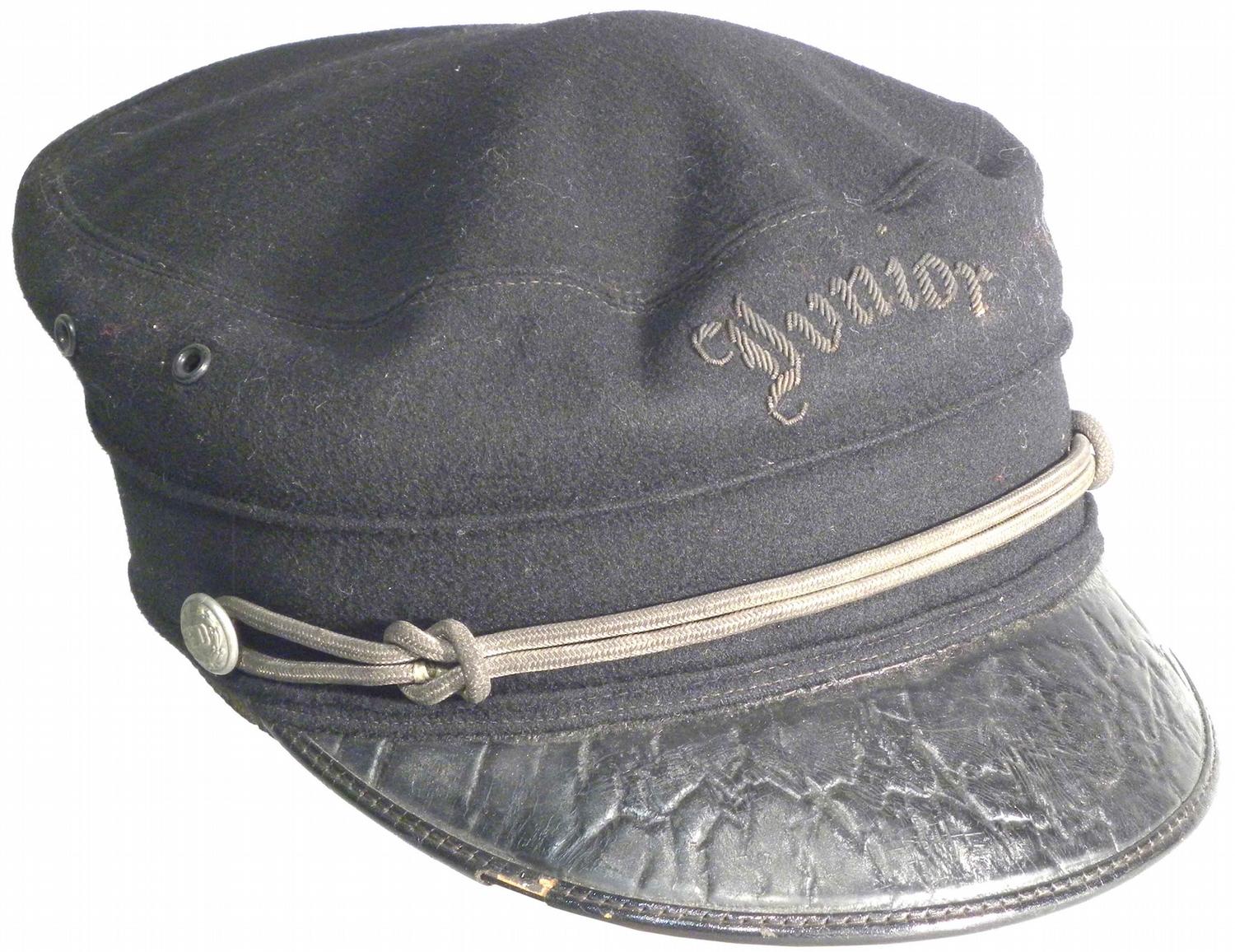 Firemen's Wool Cap. Embroidered "Junior". Worn silver braid, nickel F.D. buttons and leather bill. J.H. Goodman & Co. Reading, PA. Very good condition.
