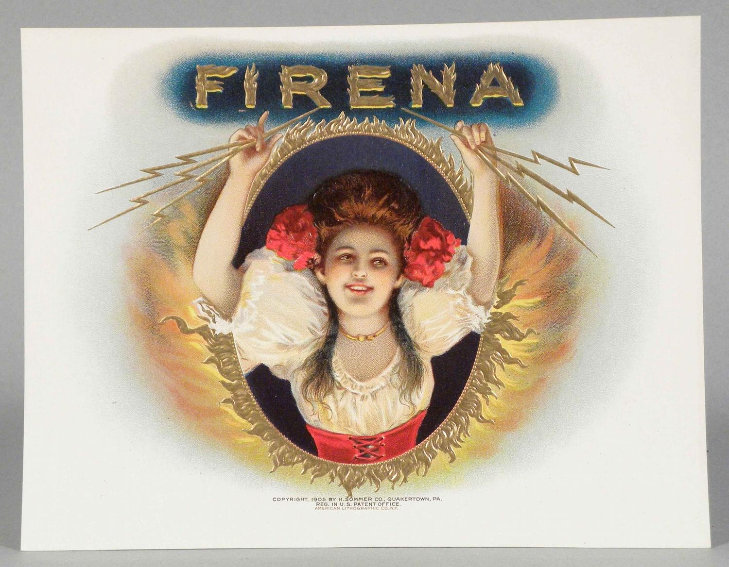 Firena Cigar Box Label. Copyright 1905 by H. Sommer Co. Quakerstown, PA. American Lithograph Co. NY. Embossed and gold leaf. Mint condition. 6 7/8 X 5 3/8 inches. Starting bid $100