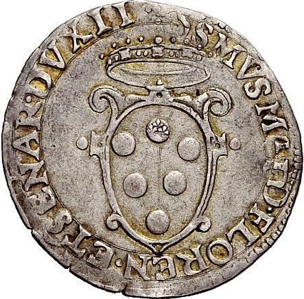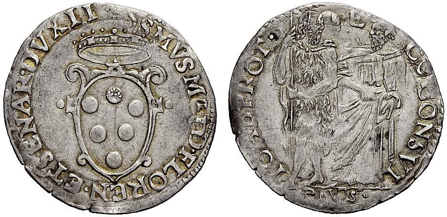Firenze. Cosimo I de’ Medici, 1536-1574. III periodo: Duca di Firenze e Siena, 1557-1569. Giulio. AR 2,99g. Stemma coronato. Rv. S. Giovanni e S. Cosmo in discussione. CNI 226-239. Galeotti XLVII, 13-31. Traccia di doppia battitura al rv., altrimenti buon BB