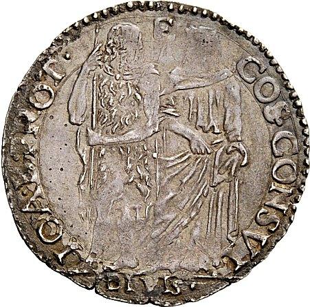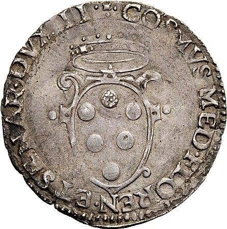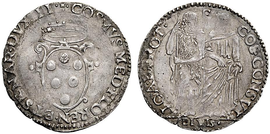 Firenze. Cosimo I de’Medici, 1536-1574. III periodo Duca di Firenze e Siena, 1557-1569. Giulio, AR 2,87g. Stemma coronato. Rv. S. Giovanni e S. Cosmo in discussione. CNI 101-108. Galeotti XLIX/7. Migliore di BB