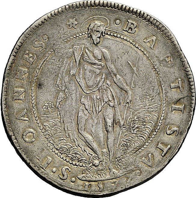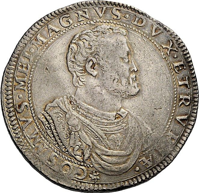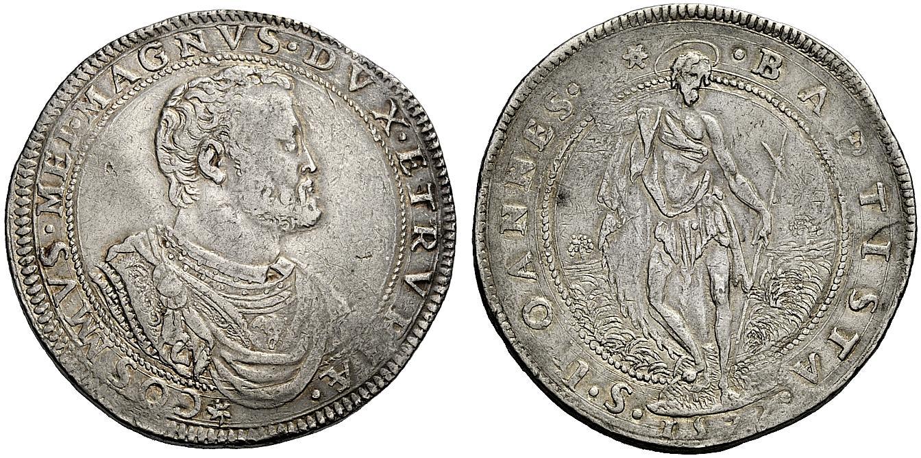 Firenze. Cosimo I de’Medici, 1536-1574. IV periodo Granduca di Toscana, 1569-1574. Piastra 1572, AR 32,50g. COSMVS MED MAGNVS DVX ETRVRIÆ Busto drappeggiato e corazzato a d. Rv. S IOANNES – BAPTISTA S. Giovanni Battista in atto di predicare; sotto, nel giro, 1572. CNI 287. Galeotti LXII/2. Ravegnani-Morosini 18. Di Giulio 4. Davenport 8383. Rara. BB