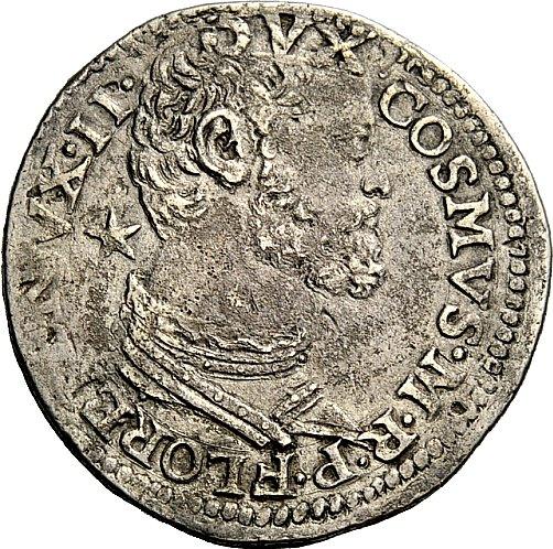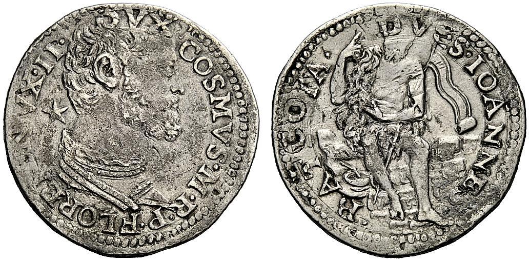 Firenze. Cosimo I de’Medici, 1536-1574. II periodo duca della Repubblica di Firenze, 1537-1557. Stellino o testone, AR 9,52g. COSMVS·M·R·P·FLORE[…]N DVX·II· – DVX Busto barbuto, a d. con accenno di corazza; dietro, stella. Rv. ·S·IOANNES· – °BAT COTA· - DV[…] S. Giovanni seduto di fronte su muricciolo, in atto di predicare; a s. in basso, una ciotola con un cucchiaio. CNI 31 var. Galeotti XVI. Ravegnani-Morosini 4. Raro. BB