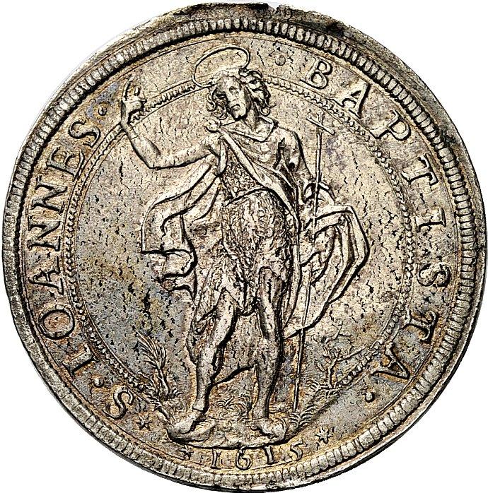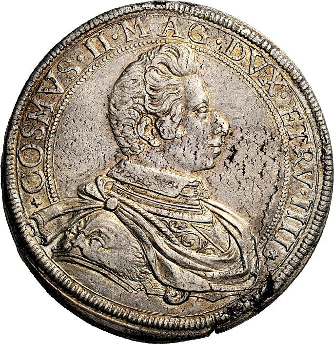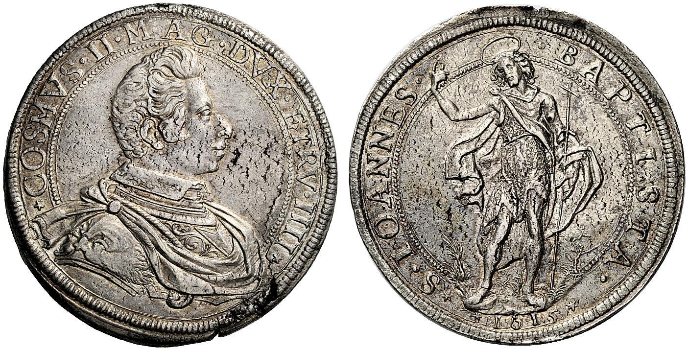 Firenze. Cosimo II de’Medici, 1609-1621. Piastra 1615, AR 32,16g. COSMVS II MAGN DVX ETRVR IIII Busto drappeggiato e corazzato a d. con colletto rigido e maschera leonina sullo spallaccio. Rv. FILIVS MEVS DILECTVS Il Battesimo di Cristo; sotto, nel giro, 1615. CNI 81. Galeotti IX/7. Ravegnani-Morosini 4. Di Giulio 66. Molto rara. Leggera patina iridescente, lieve mancanza di metallo alle ore 5 del dr. q.Spl