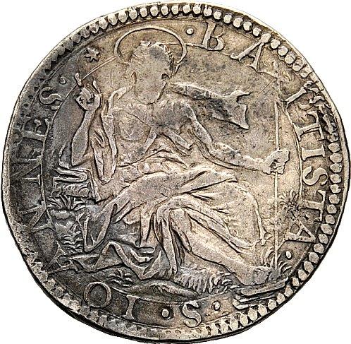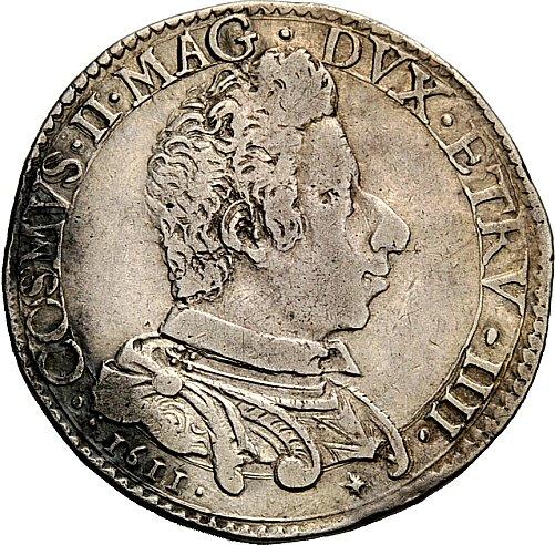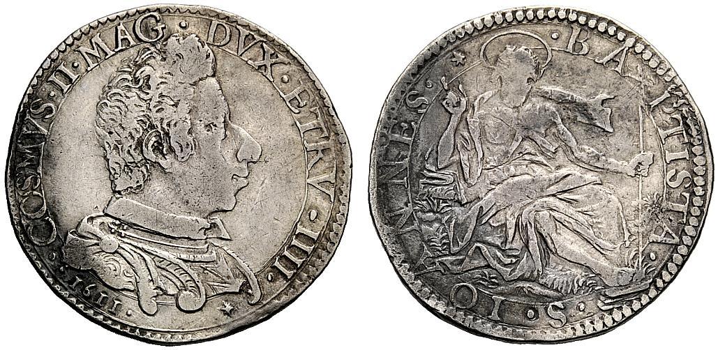 Firenze. Cosimo II de’Medici, 1609-1621. Testone 1611, AR 9,21g. Busto drappeggiato e corazzato a d.; sotto, nel giro, 1611. Rv. S. Giovanni Battista seduto di fronte, benedicente, regge con la mano s. una lunga croce astile. CNI 53-56. Galeotti XII/2 var. Ravegnani-Morosini 8. Molto raro. q.BB