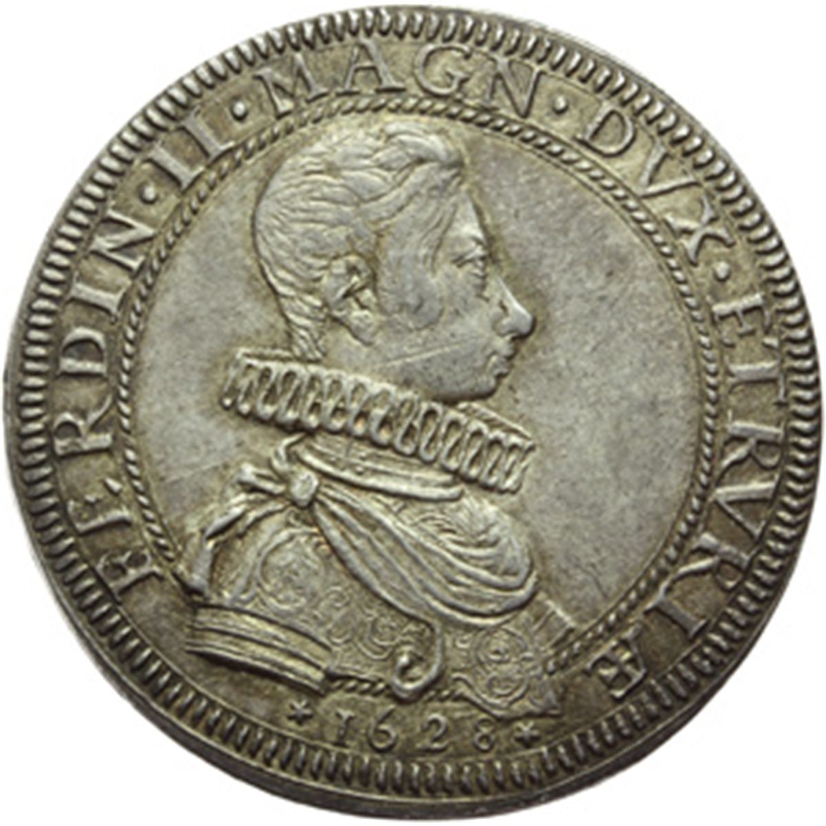 Monete e Medaglie di Zecche Italiane. Firenze. Ferdinando II de' Medici (1621-1670). Piastra 1628. Gal. X/5 var. Di GiU. 81; Rav. Mor. 3. Dav. 4199. AG. g. 32.27 RR. Bella patina da monetiere. SPL. Altissima conservazione.