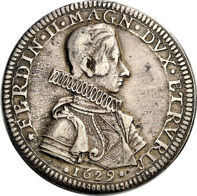 Firenze. Ferdinando II de’Medici, 1621-1670. Piastra 1629, AR 32,29g. Busto drappeggiato e corazzato a d. con collare alla spagnola; sotto, nel giro, 1629. Rv. S. Giovanni in atto di predicare. CNI 57. Galeotti XI/2. Ravegnani-Morosini 3. Di Giulio 83. Rara. q.BB
