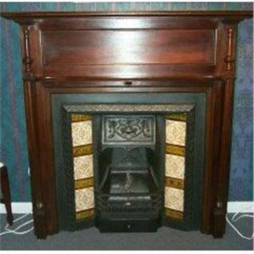 Irish firplace with original tiles and original mahogany surround. The dust cover on the bottom has been replaced.