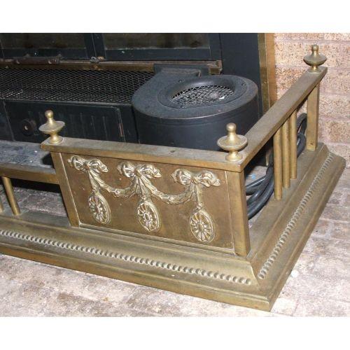 Continental. 19th Century. Cast brass. A fine brass fireplace fender with a square stepped fence design, square stepped fence design, square columns with urn finials and swag and tassel adornments. 9" high X 50" wide