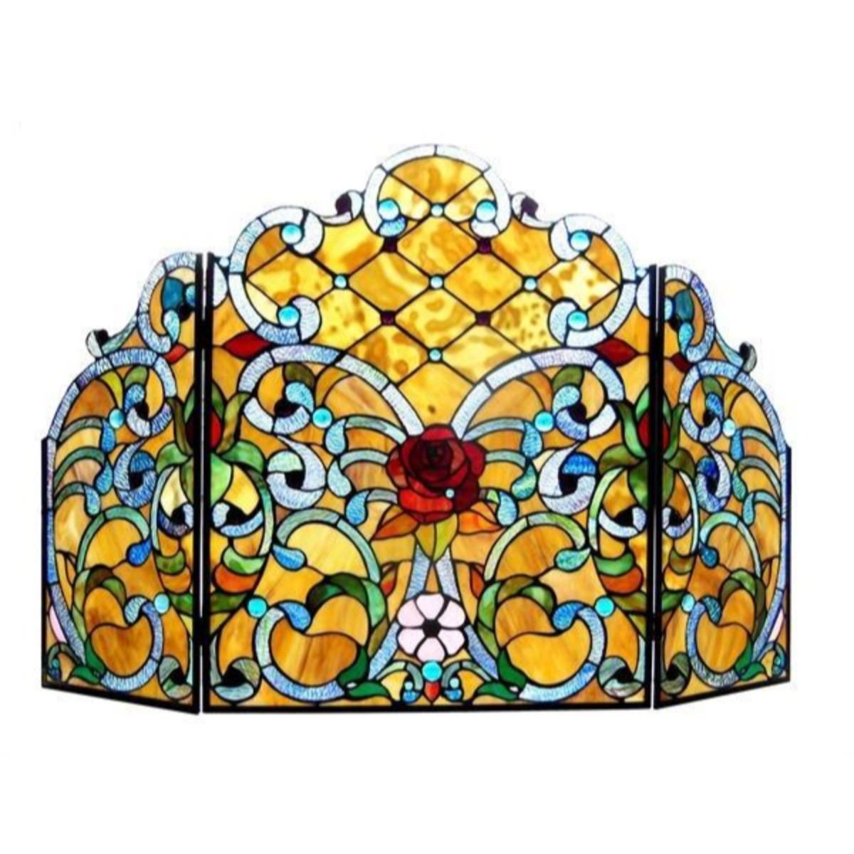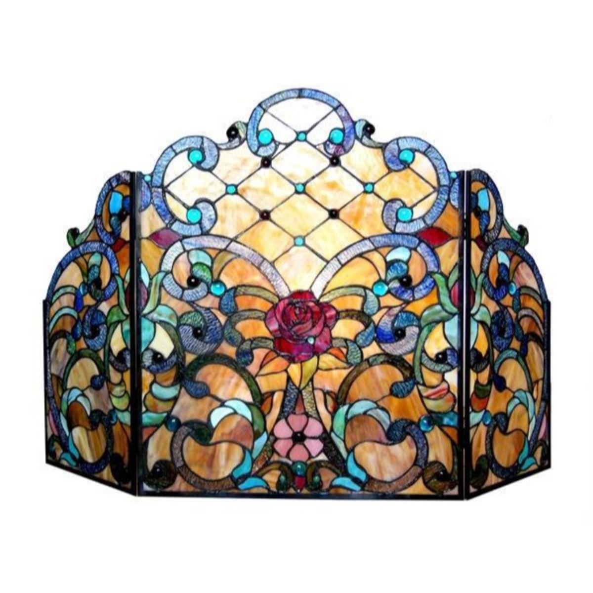 "ROZE" Tiffany-glass Rose 3pcs Folding Fireplace Screen 44x28 ROZE, an exquisitely designed vintage Victorian fireplace screen features a red rose for which it is named. The beautiful handcrafted arrangement of stained glass and gem-like cabochons will be a welcome addition to any fireplace. Quality materials are used throughout. Framed in metal with an antique bronze finish, this hinged 3-piece screen is a true masterpiece for any fireplace. In the style of Tiffany. The most famous was the stained leaded glass lamp. ... Due to Tiffany's dominant influence on the style, the term 'Tiffany lamp' or 'Tiffany style lamp' is often used to refer to stained leaded glass lamps. This work is in the style of Louis Comfort Tiffany. Original Tiffany lamps can cost literally hundreds of thousands of dollars. More information on the Louis Comfort Tiffany's company: A Tiffany lamp is a type of lamp with a glass shade made with glass designed by Louis Comfort Tiffany and his design studio. The most famous was the stained leaded glass lamp. Tiffany lamps are considered part of the Art Nouveau movement. The first Tiffany lamp was created around 1895. Each lamp was handmade by skilled craftsmen, not mass- or machine-produced. Its designer was not, as had been thought for over 100 years, Louis Comfort Tiffany, but a previously unrecognized artist named Clara Driscoll who was identified in 2007 by Rutgers professor Martin Eidelberg as being the master designer behind the most creative and valuable leaded glass lamps produced by Tiffany Studios.[1][2] Tiffany's first business venture was an interior design firm in New York City, for which he designed stained glass windows. Tiffany lamps gained popularity after the Worlds Columbian Exposition in Chicago in 1893, where Tiffany displayed his lamps in a Byzantine-like chapel. His presentation caught the eye of many people, most notably Wilhelm Bode and Julius Lessing, directors of state museums in Berlin. Lessing purchased a few pieces to display in the Museum of Decorative Arts, making it the first European museum to own Tiffany glass. Though Tiffany's work was popular in Germany, other countries, such as France, were not as taken by it because of its relation to American crafts. Tiffany was only able to break into the French market by having the production of his works taken over by Siegfried Bing, with the assistance of many French artists. Without Bing’s access and contacts in Europe, Tiffany would not have had as much success selling his works to a European audience. Tiffany’s success throughout Europe was largely due to the success of his works in the German and Austro-Hungarian markets through a series of exhibitions beginning in 1897 at the International Art Exhibition in Dresden. After the partnership between Tiffany and Bing ended, interest in Tiffany products began to slowly decline in Europe.[3] Cntr Pane Width (in) 22.00 Side Pane Width (in) 11.00 Side Pane Height (in) 24.00 Cntr Pane Height (in) 28.00 Overall Materials Glass & Copper Frame Est. Glass Beads 52.00 Est. Glass Cuts 497.00 Overall Width (in) 44.00 Overall Height (in) 28.00 Shade Materials Tiffany-glass Specific Uses Indoor