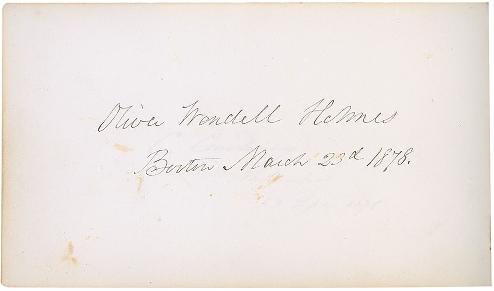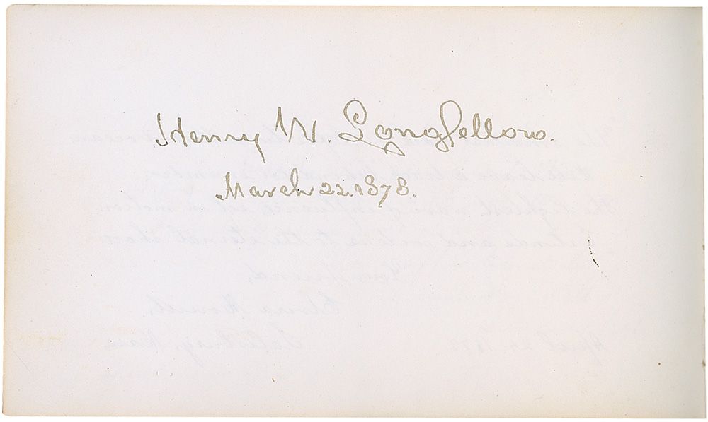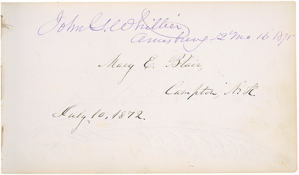 Ink signatures of John Greenleaf Whittier, Henry Wadsworth Longfellow, and Oliver Wendell Holmes on individual off-white album pages, 7 x 4, still contained in their original hardcover autograph album. In fine condition, with partial binding separations and scattered wear to album.